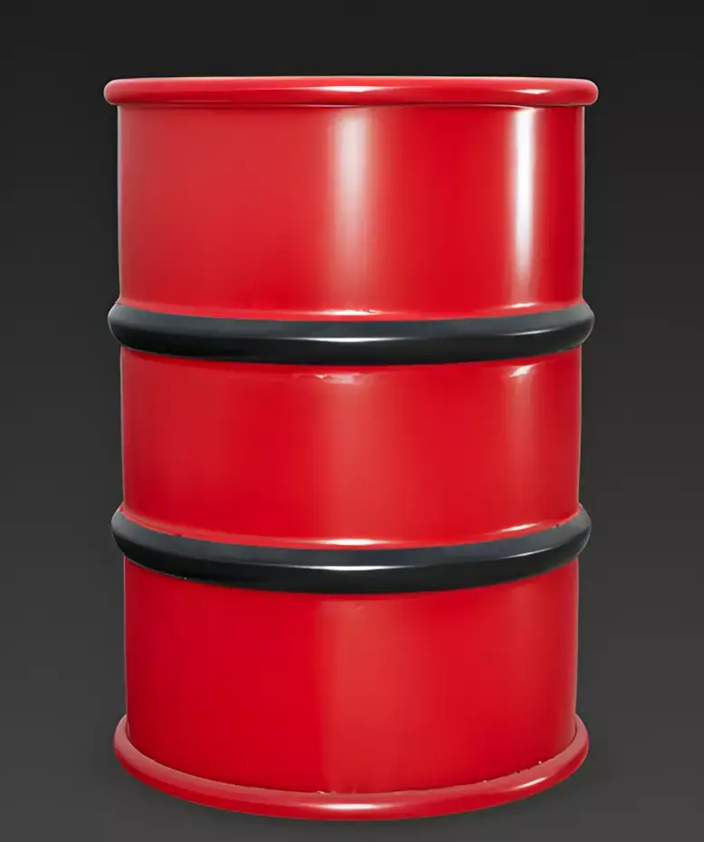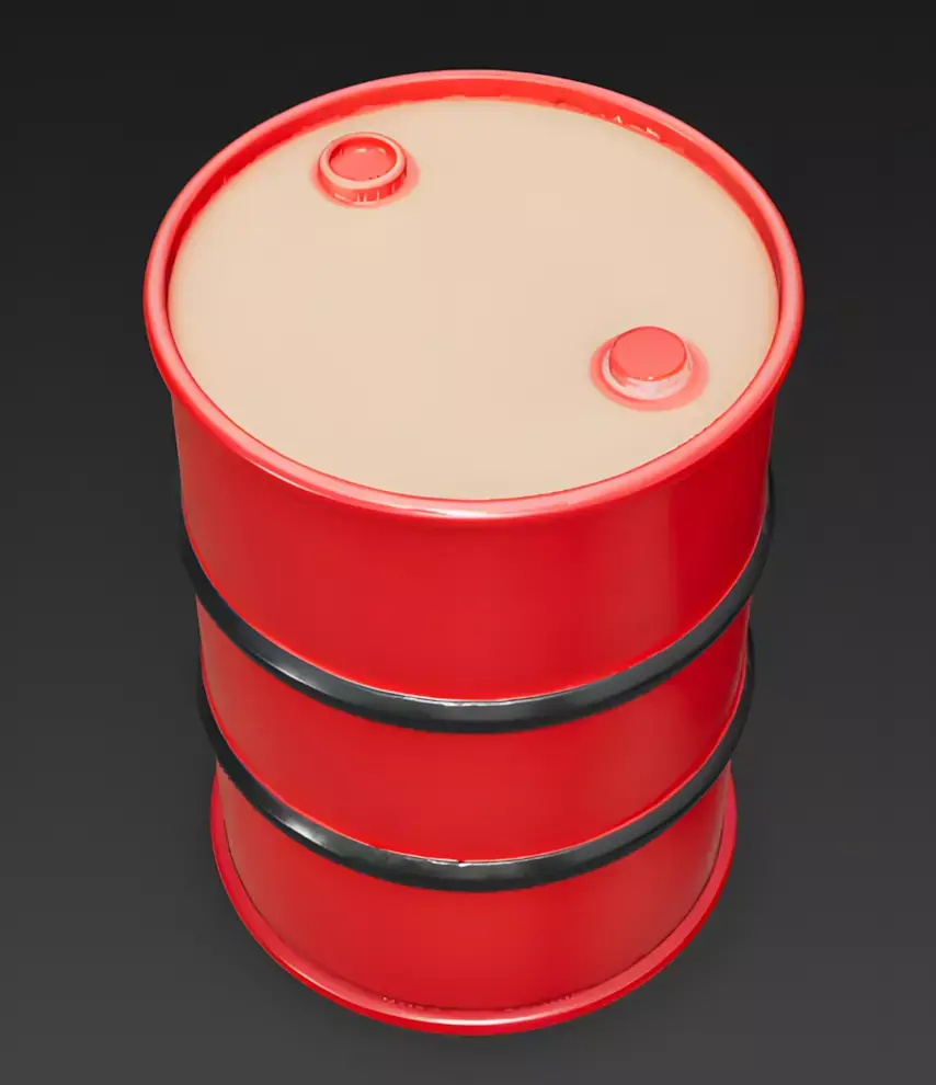 Simplified Industrial LidThe top of the barrel features a recessed lid design with two simplified, solid red circular bung caps. These components are modeled as unadorned geometric shapes, strictly avoiding intricate mechanical details to maintain a consistent and optimized design language.