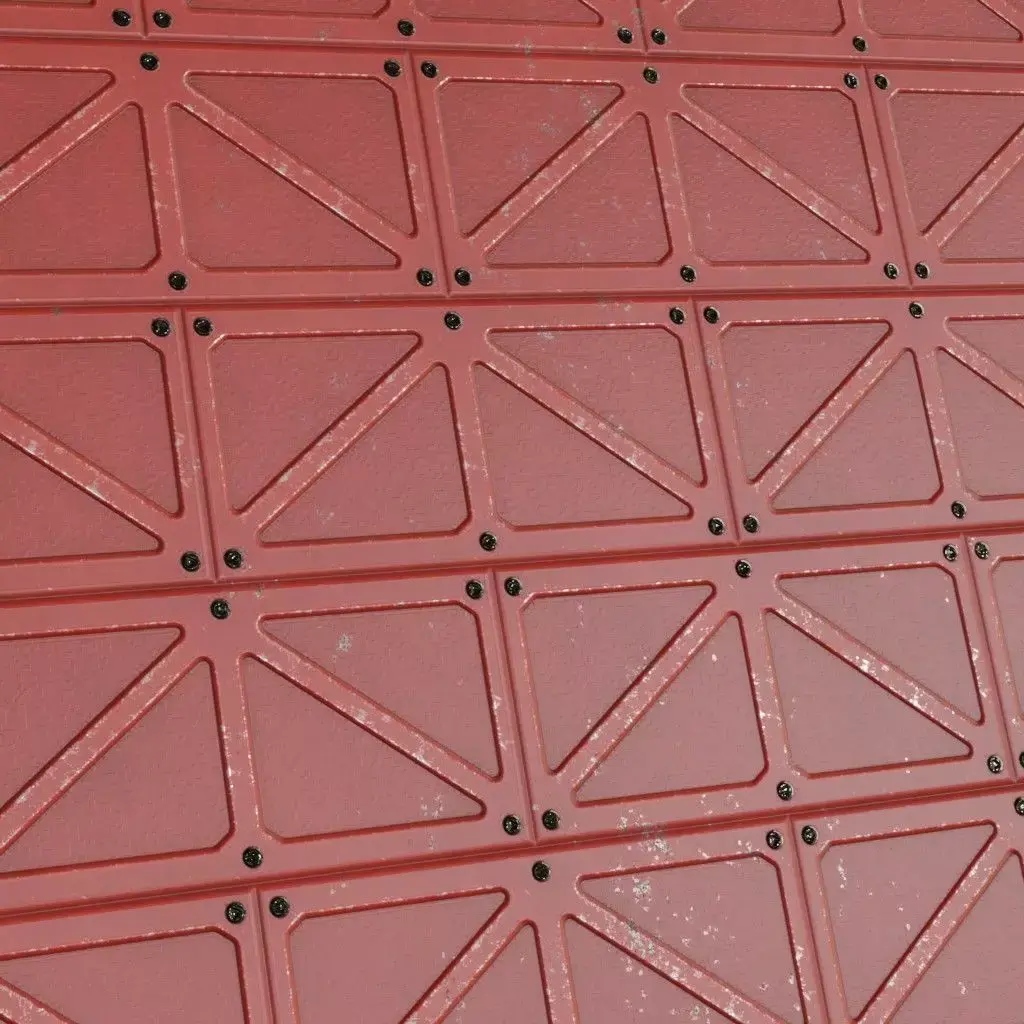 This is a PBR Texture Pack of Red Metal Plate. The material features a robust industrial design with large triangular metal panels secured by heavy-duty black rivets. The surface showcases realistic wear and tear, including subtle paint scuffs and edge weathering, making it ideal for armored starship hulls, heavy industrial gates, or futuristic bunker walls. All essential maps, including BaseColor, Normal, Roughness, Height, Metallic, and Opacity, are provided to ensure high-fidelity realism and accurate light interaction in your 3D scenes.
