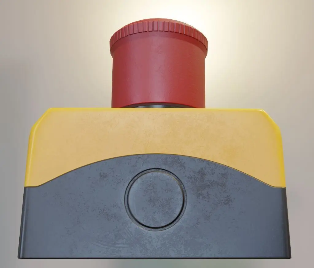 - Hier sehen Sie ein 3D-Modell eines Not-Aus-Schalters.