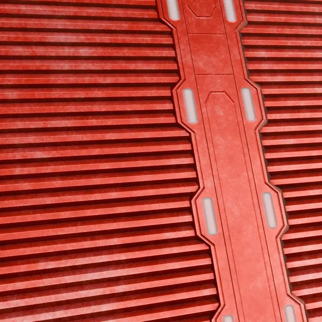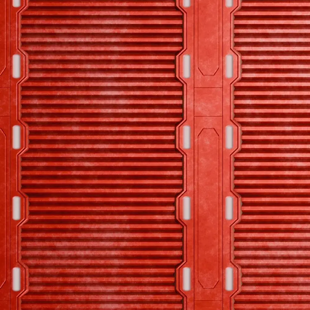 This is a PBR Texture Pack of Red Sci-Fi Metal Panel. The material features a sophisticated futuristic design with bold vertical ribbing and integrated glowing light strips, perfect for starship corridors, high-tech engine rooms, or futuristic server bays. All essential maps, including BaseColor, Normal, Roughness, Height, Metallic, and Opacity, are provided to ensure high-fidelity realism and accurate light interaction in your 3D scenes.