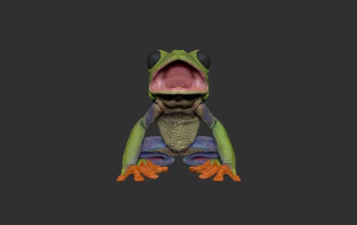 IntroductionZbrush Sculpt of a Red Tree Frog. This file contains 3 Subtools, Cornea, Inner eye and the Frog body. A seated pose and a Neutral pose has been included with the project, this can be toggled using the Layers panel in Zbrus. The model has up to 6 subdivision levels and has been retopologied for deformation purposes. Model has UVs on 1 tile but eyes have seperate UV sets