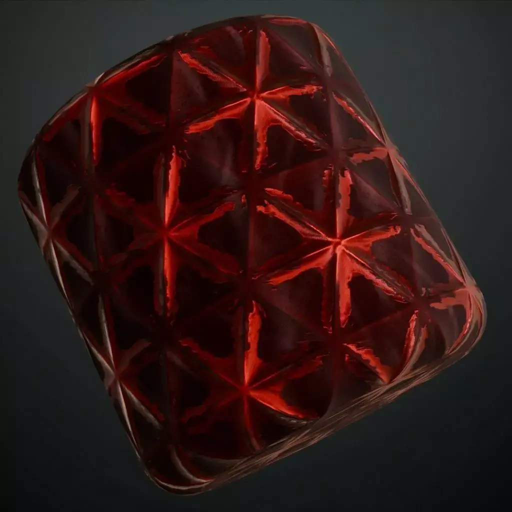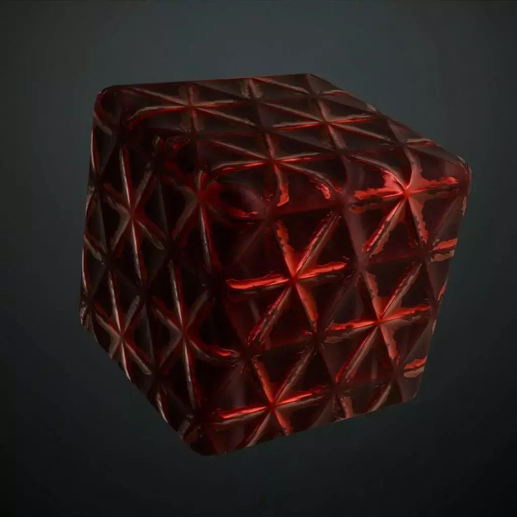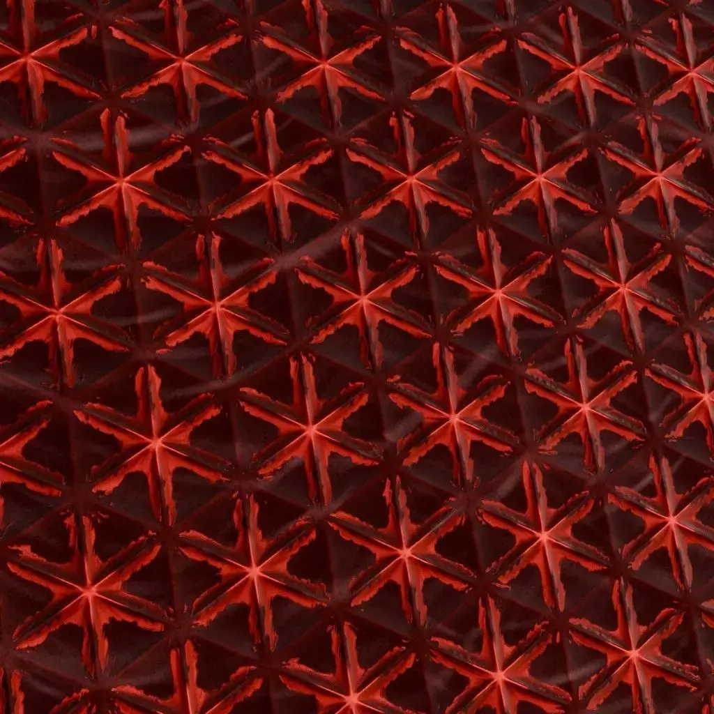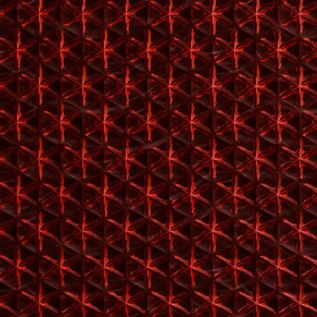 This is a PBR Texture Pack of Reddish Sci-Fi Wall. This material showcases a sophisticated high-tech design featuring a complex star-shaped geometric relief within a triangular grid. Its deep red, semi-glossy finish is ideal for advanced spacecraft interiors, futuristic command centers, or high-end sci-fi architectural panels. All essential maps, including BaseColor, Normal, Roughness, Height, Metallic, and Opacity, are provided to ensure high-fidelity light interaction and structural depth in your 3D scenes.