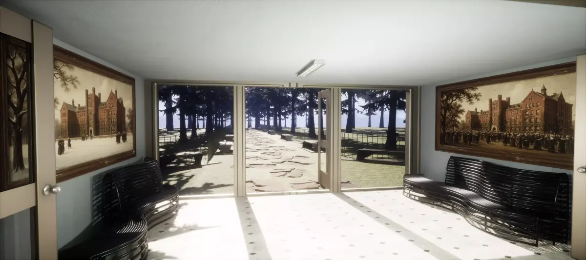 The project focuses entirely on interior spaces while maintaining a strong sense of an external world through windows and entrances, revealing surrounding tall trees, benches, and fenced pathways, creating the feeling of a complete and believable campus beyond the playable area.