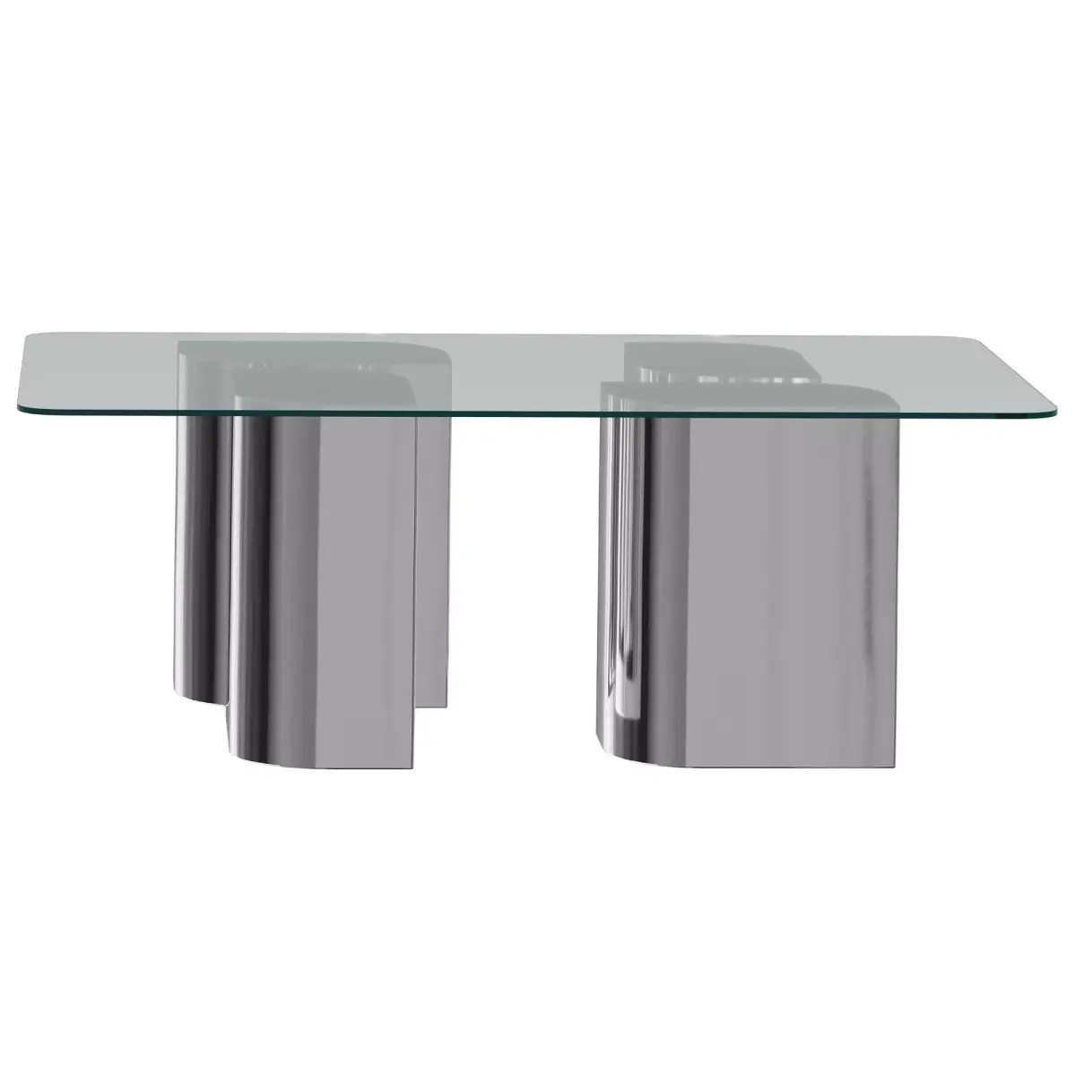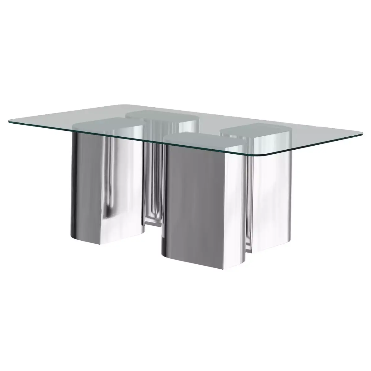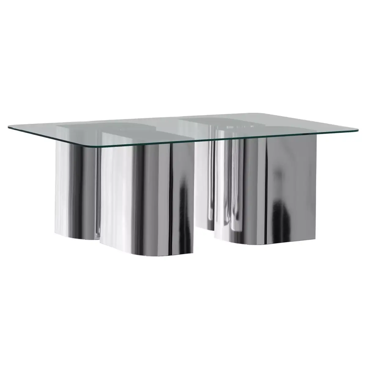 The Reed Coffee Table presents a bold exploration of form and material, combining sleek chrome with a sculptural design that feels both substantial and light. The glass top appears to float above the floor, supported by a base of polished chrome that curves gracefully, creating a sense of fluidity and movement.The reflective surface of the chrome interacts with the surrounding space, capturing light and shadow in a dynamic play. The minimalist design is enhanced by the table's architectural presence, where the chrome base offers both strength and sophistication.This piece is not only a functional centrepiece but also an artful statement that elevates any living space.