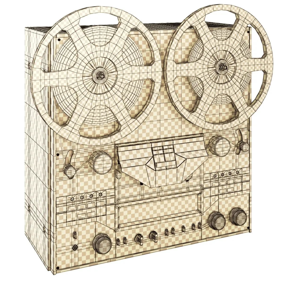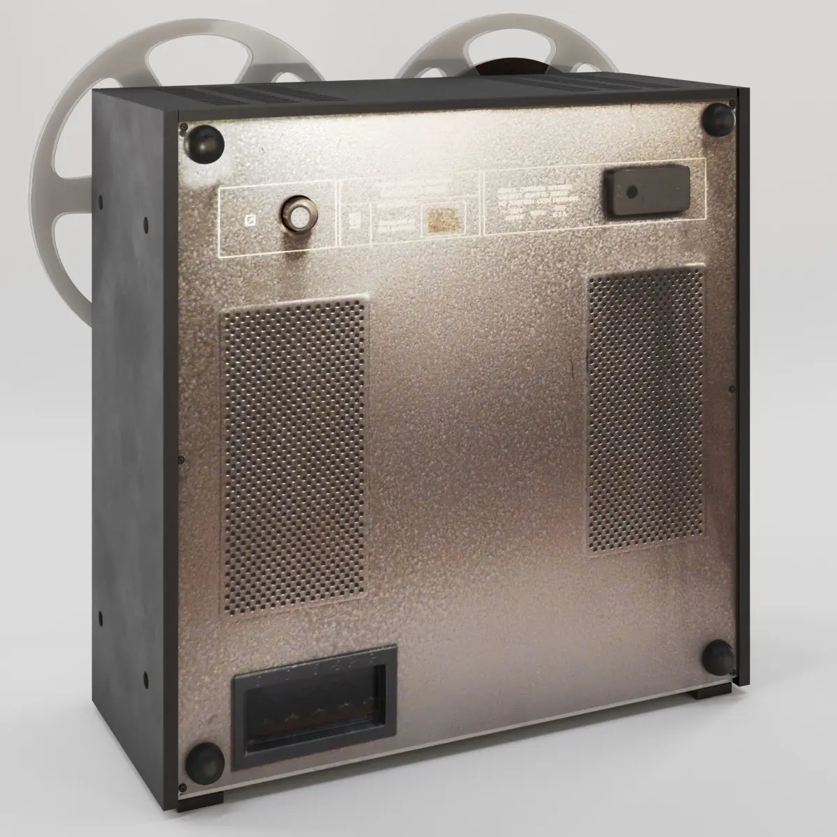 On the tape recorder and reel each there is one texture-set with non-overlapped UV and a universal metallic PBR material (suitable for any modern render engine)