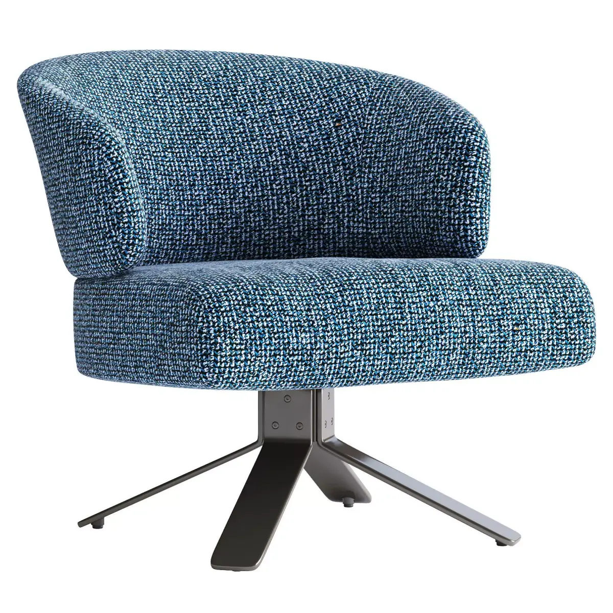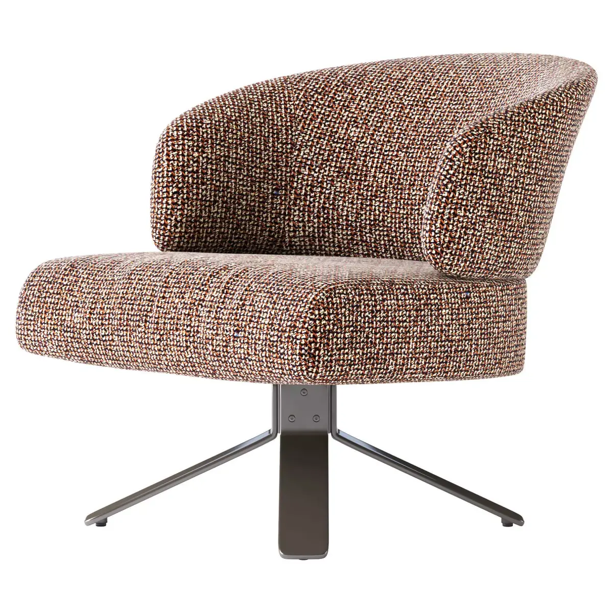 The Reeves “Small” armchair with swivel base with automatic return to center rests on four pressure-cast metal crosspieces with light Bronze satin finish.