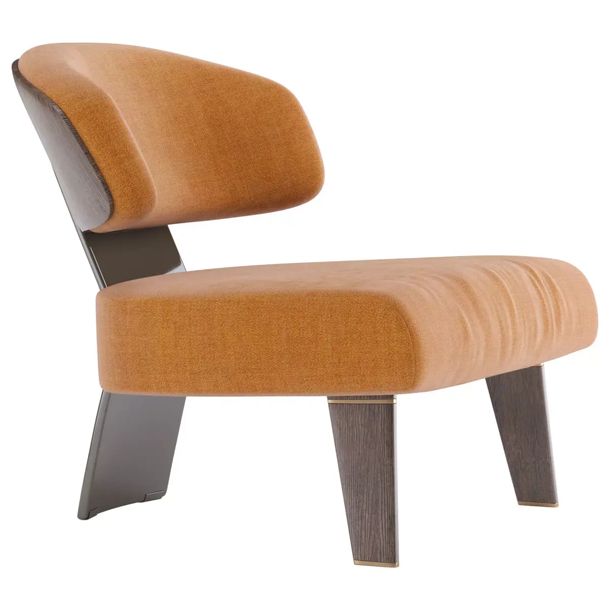 The backrest in curved plywood with Sucupira veneer and stained Mink finish is bonded to an internal shell in structural polyurethane and a molded, flexible, high-density polyurethane layer. The back of the armchair rests on a metal support with a glossy Bronze painted finish while the front legs are in solid Sucupira wood with stained Mink color finish. The Reeves “Wood” armchair can be paired with its namesake ottoman.