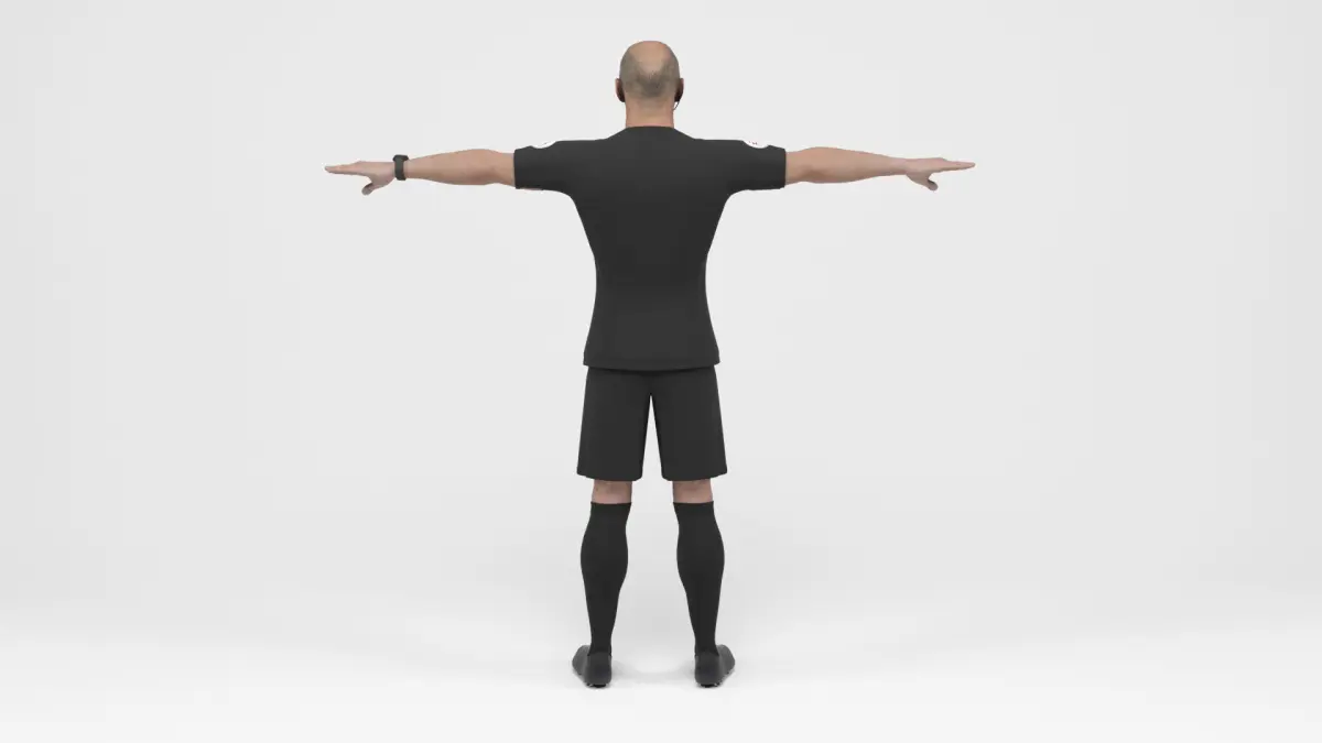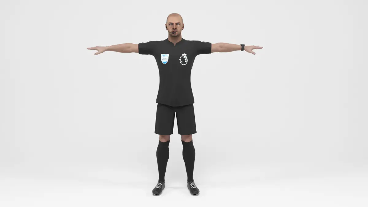3D model of a Referee of football with shorts, t-shirt, socks and boots (whistle, microphone and cards included). The model includes bones and four sample animations. Model ideal to be used in games, advertising and video production.