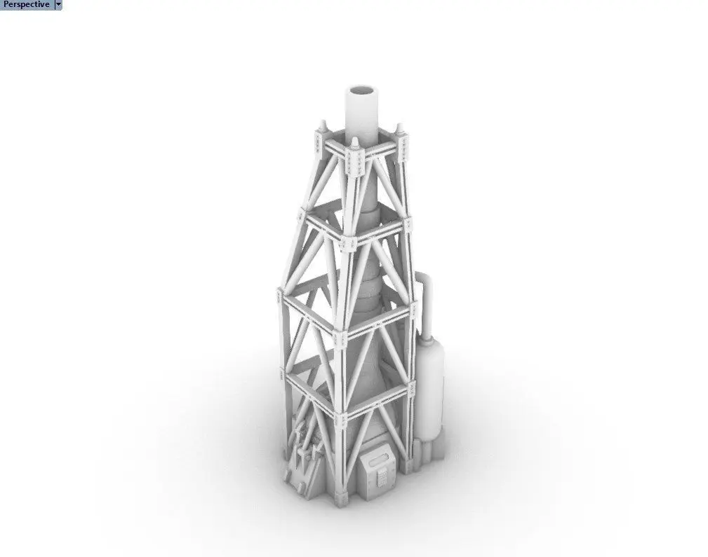 Refinery boiler for tabletop miniature sceneries, dioramas and low poly gaming, design, animation. Includes 1 type of unit, large boiler built in a staged condenser unit with mutiple residue tanks. Ideal for industrial modern, interwar and scifi settings over plastic, paper and cardboard sceneries.