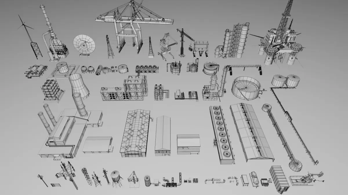 Items:Fence, Gate, Anteena, Water Tank, Storage Tank, Chimney, Tank, Fan, Staircase, Bridge, Satellite Dish, Electricity Pylon, Crane, Silo, Container Crane, Oil Rig, Gas Tank, Buildings, Complex, Industrial House, Fuel Tank, Storage, Complex