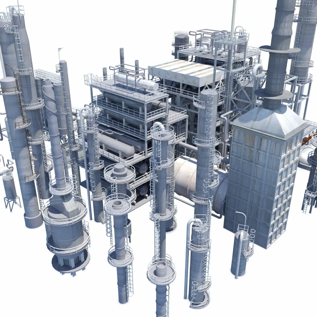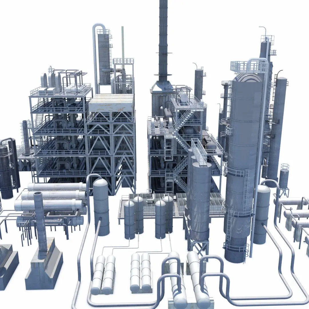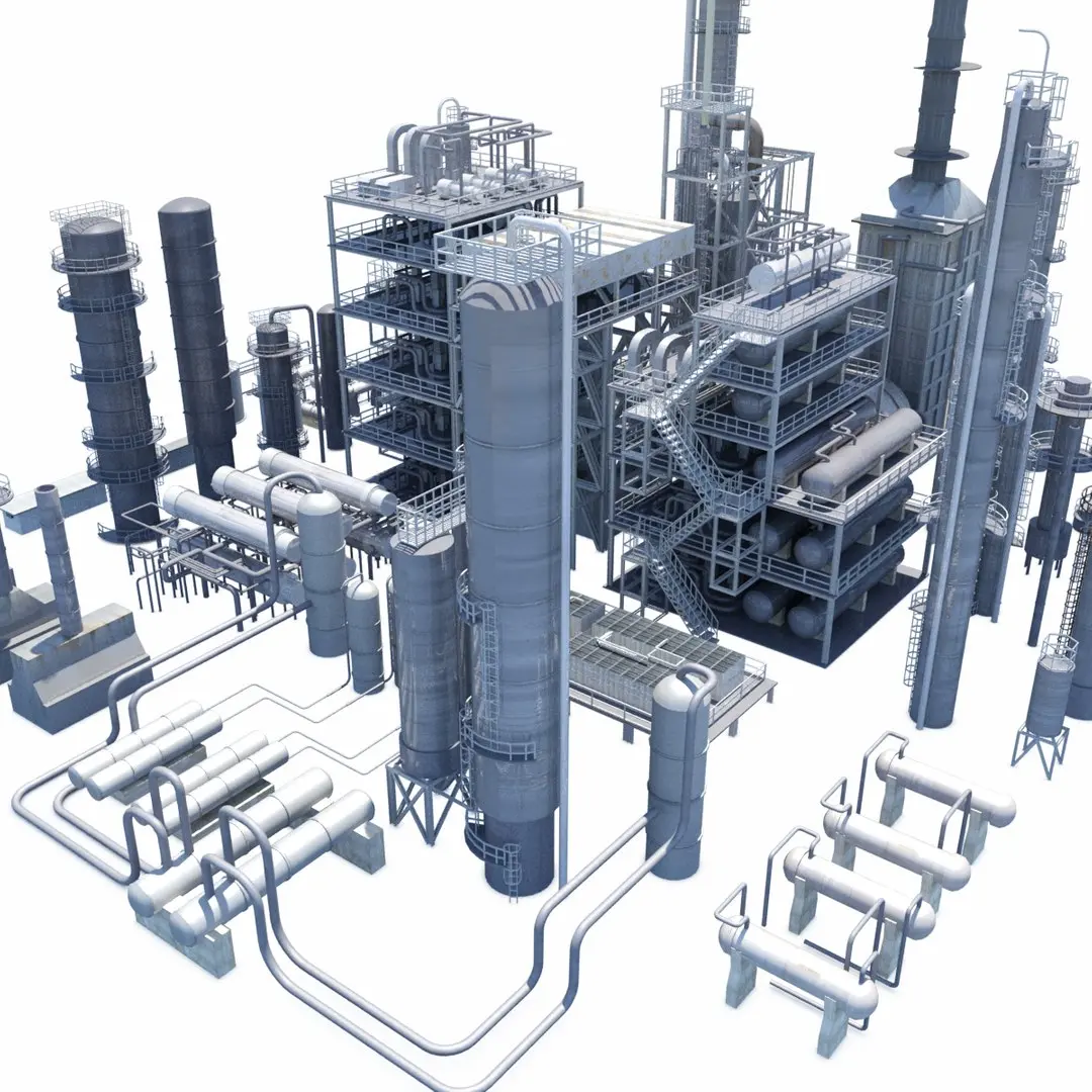 A large collection of refinery towers, blocks, and pipe racks used in the oil and gas industry.