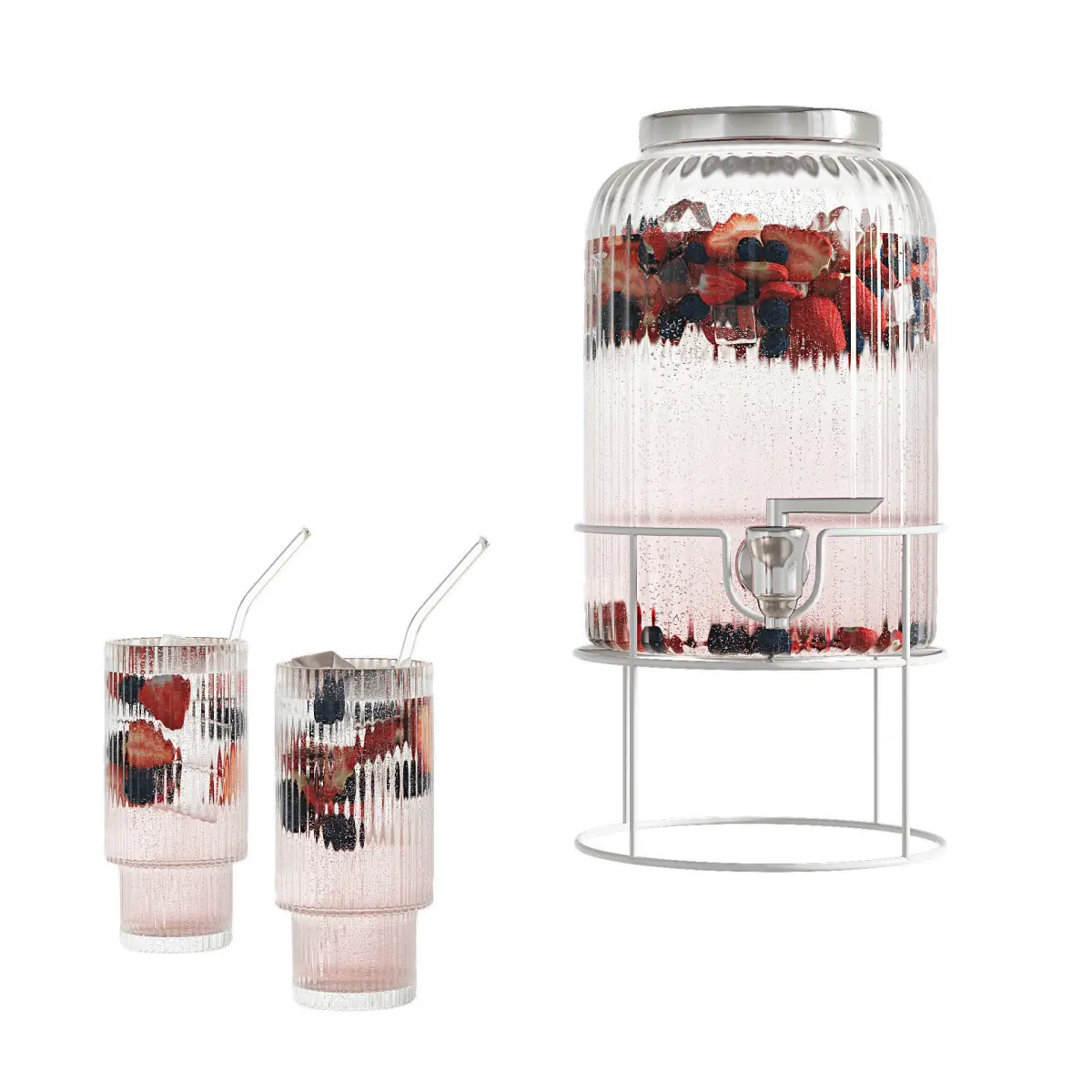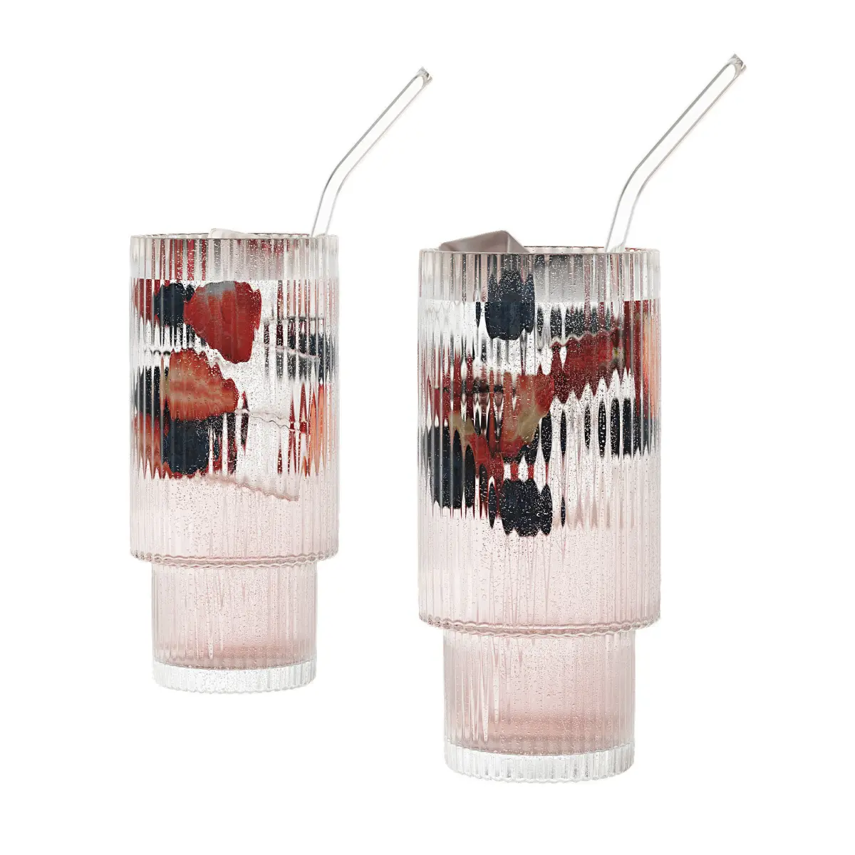 - Fluted tall glasses with glass straws. The arrangement of fruits and ice in each glass is different.