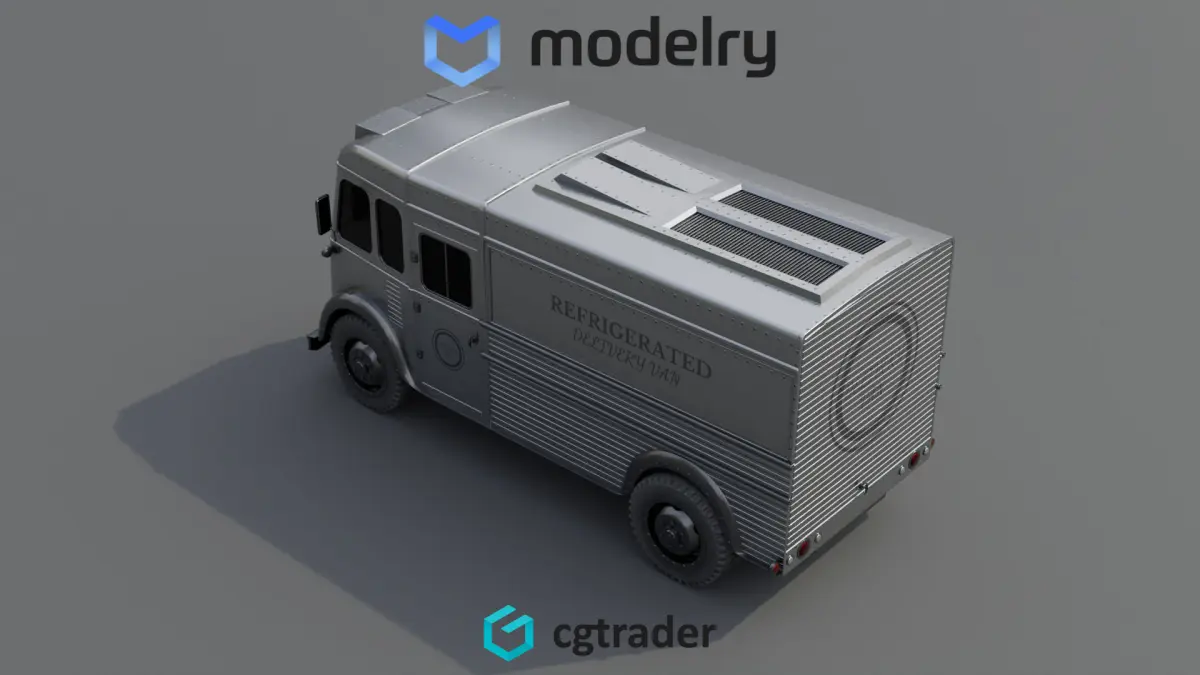 A refrigerated truck from the historical timeline, featuring a sleek silver exterior with rounded edges, large windows, and a prominent logo of the delivery company on the side. The truck is equipped with a unique cooling system, visible through vents on the top, ensuring the safe transportation of perishable goods. The wheels are sturdy and black, contrasting with the metallic body of the truck.