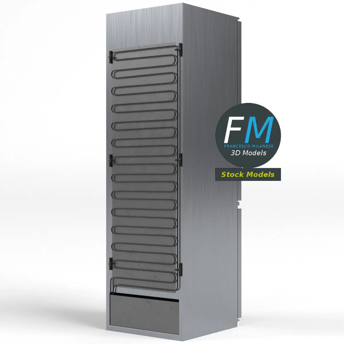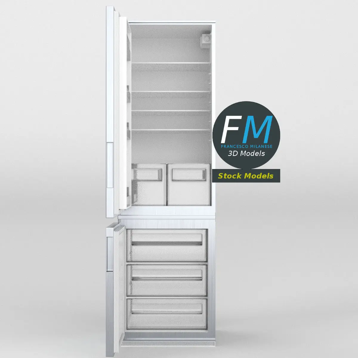 Refrigerator 3D Model. 29 individual objects (trays, drawers, doors, thermostat, door sensor, ...), sharing 3 non overlapping UV Layout maps, Materials (doors, case, glass) and PBR Textures sets. Production-ready 3D Model, with PBR materials, textures, non overlapping UV Layout map provided in the package.Quads only geometries (no tris/ngons).Easily customizable: UV unwrapped geometries, so you can create new Textures (or modify the existing ones) using the UV Layout maps provided in the package (as png with alpha).Each Object, Material or Texture provided in the package has a unique, meaningful name.Made in Blender 3.3 with Cycles Principled BSDF PBR shader with textures included (Eevee compatible), then exported to OBJ and FBX (with embedded PBR Textures); materials and textures made in Substance Painter, exported for PBR, Cycles, V-Ray, Unity, Unreal.PROMO IMAGES: the first image has been rendered in Cycles for Blender; in particular, you can find 11+ promo images in this description: