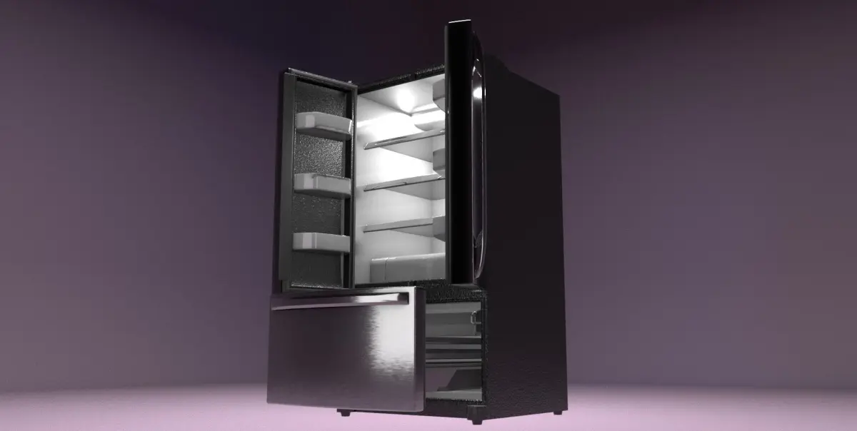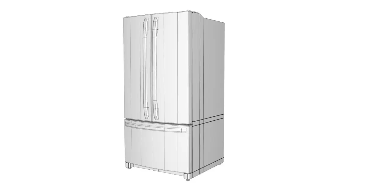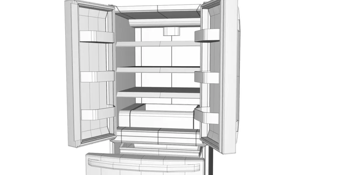 A modern refrigerator appliance. It has French doors with stainless steel surfaces. This has an interior, and is rigged so it can be opened easly. The interior has shelves and drawers (Which are not rigged). This can be subdivided.