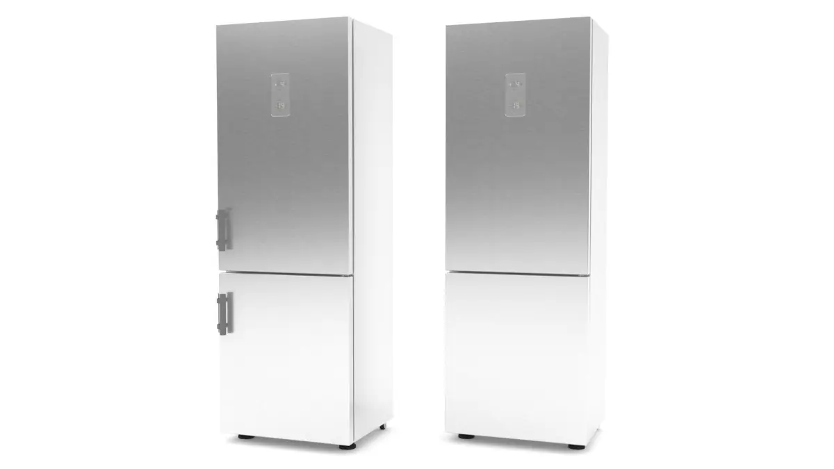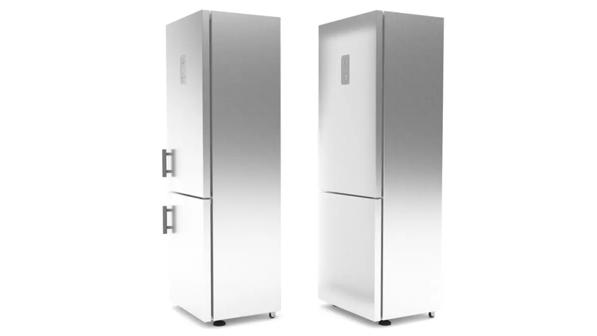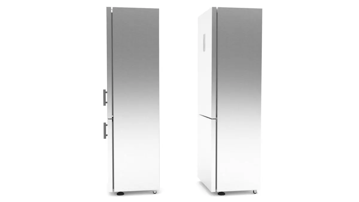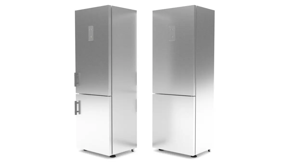3ds Max model of Refrigerator. This model is not related to any particular brand. The main material is stainless steel. The upper door has a touch screen with luminous figures to adjust the temperature for the upper and lower sections. Unit measures with a handle: 615mm deep x 705mm wide x 2050mm high. Unit measures without a handle: 565mm deep x 700mm wide x 2050mm high.
