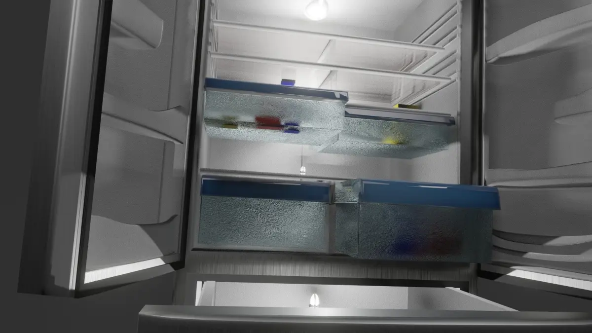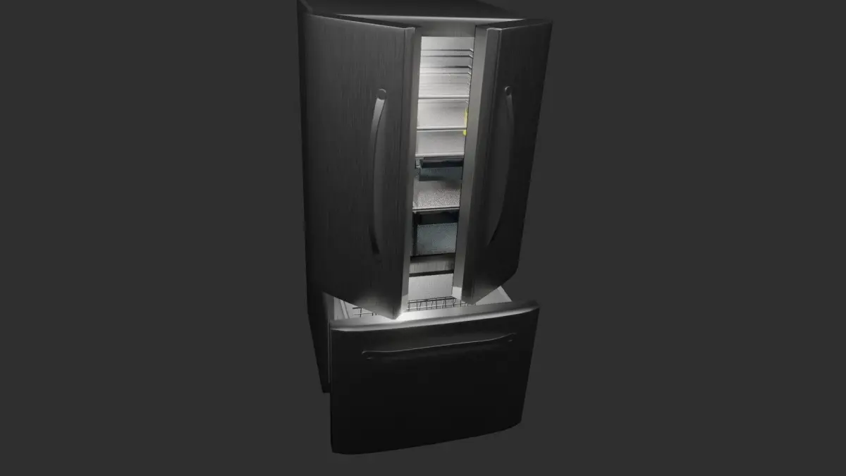Stainless steel refrigerator with versions for eevee and cycles as well as obj file. It has fully functional doors, 4 clear plastic drawers for cheese and vegetables, glass shelves and white plastic compartments in each door including a shielded butter tray. Pull out freezer on bottom with dividing wire shelves.
