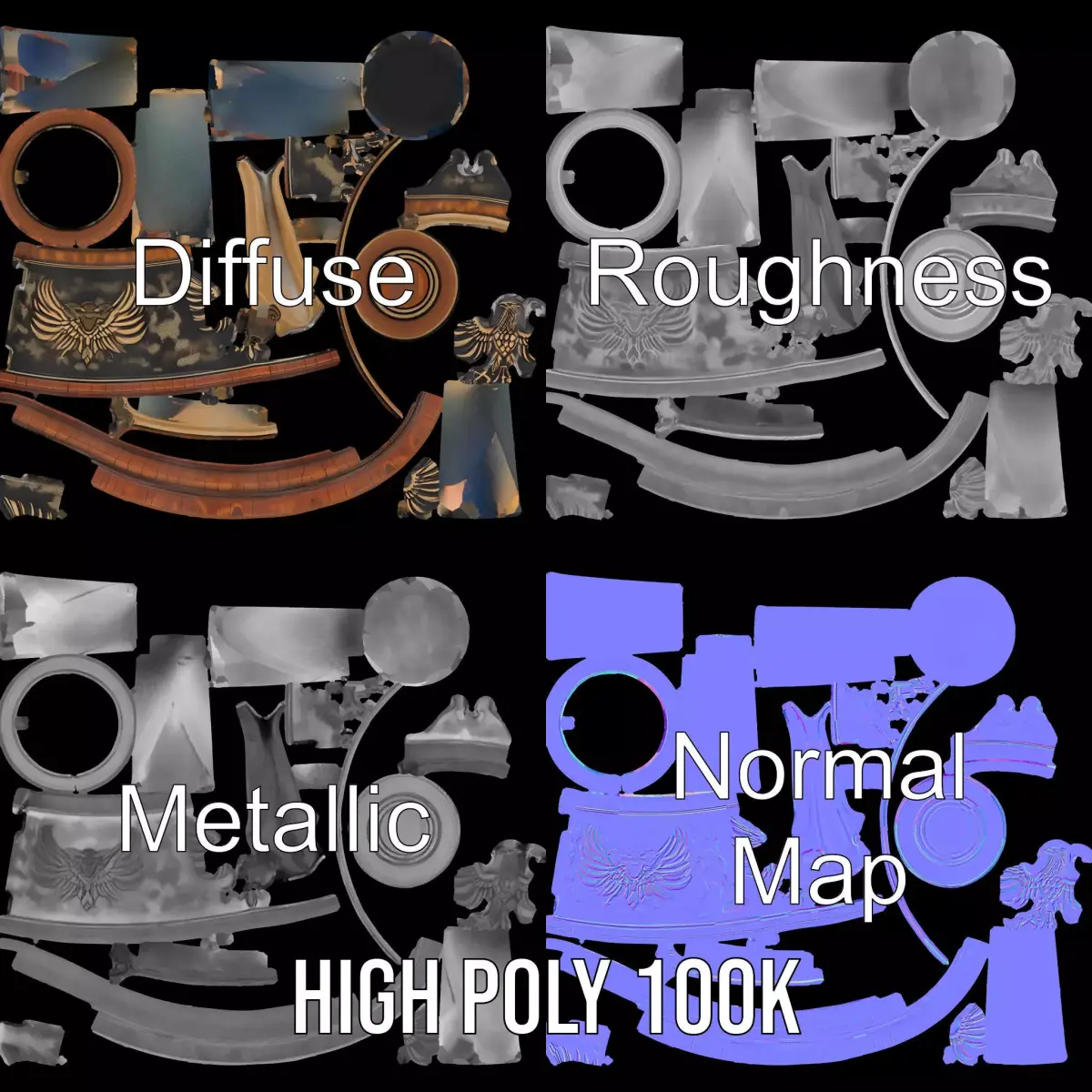 This beautifully crafted regal eagle tankard is designed with intricate detailing and a metallic finish, perfect for medieval or fantasy-themed projects. Its robust structure and elegant appearance make it ideal for use in virtual reality settings, historical simulations, and game environments. Each model has 3 levels of detail: low-poly (1000 triangles for mobile), middle-poly (10,000 triangles for environment), and high-poly (100,000 triangles), allowing for use in production rendering, game engines, and interactive presentations based on the LOD System principle. The model's textures are PBR, Diffuse, NormalMap, and reflection/roughness/metallic, compatible with any modern rendering engine. All models are accurately unwrapped with no overlapping UVs. Textures are 4096*4096 in size. If you like this model, please leave a like and comment!