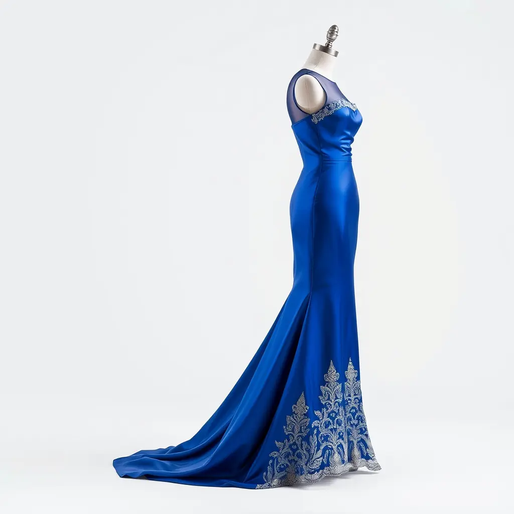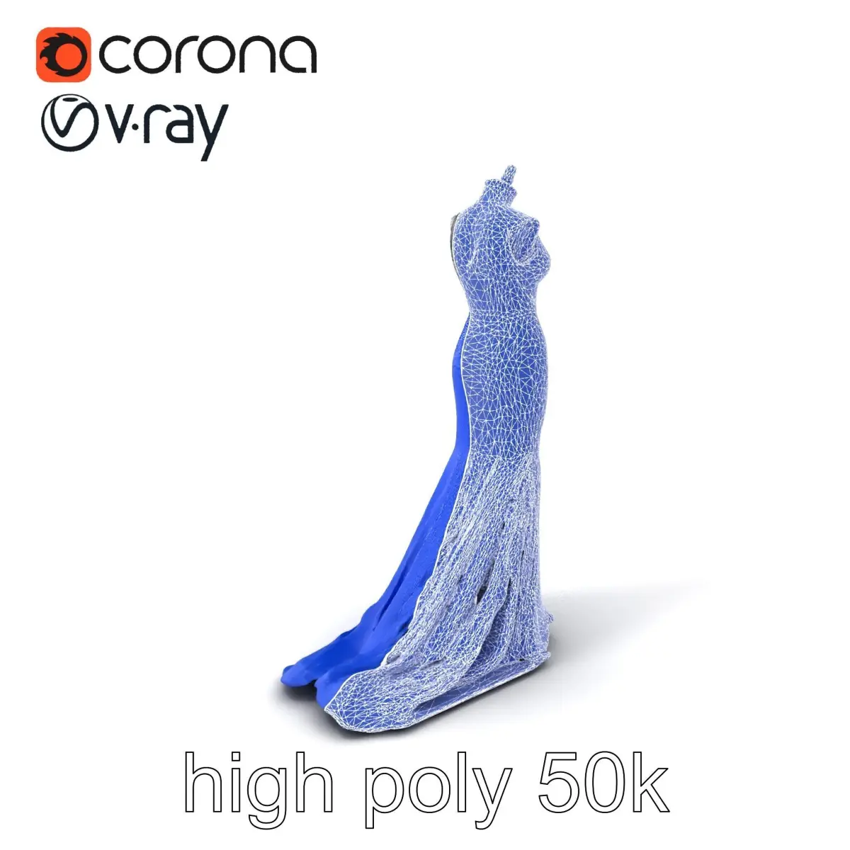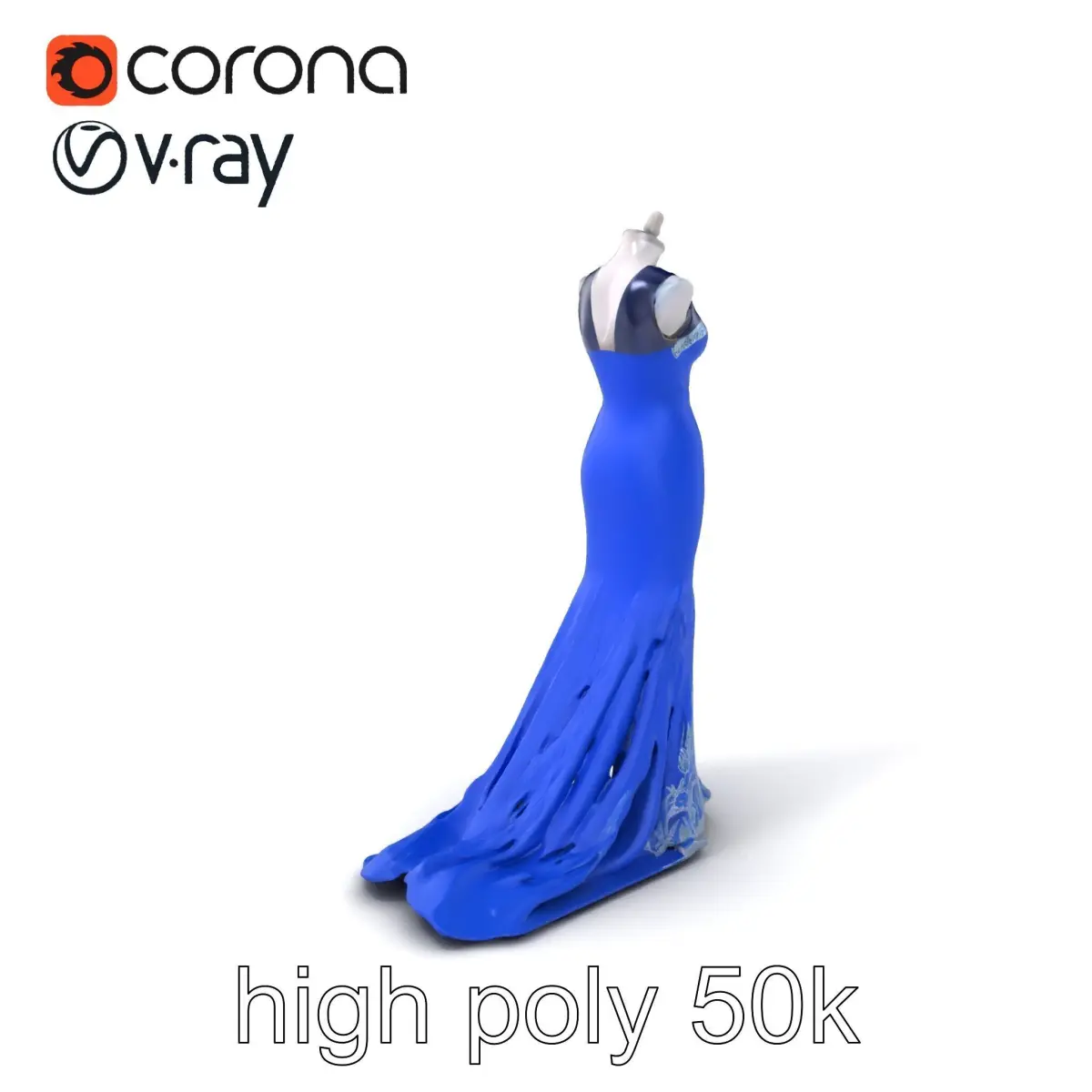 The Regal Evening Gown Model Pack features a stunning floor-length dress with a mermaid flare, designed in an exquisite royal blue silk. This 3D model includes intricate beadwork across the fitted bodice and elegant lace appliques at the hemline for true regal elegance.