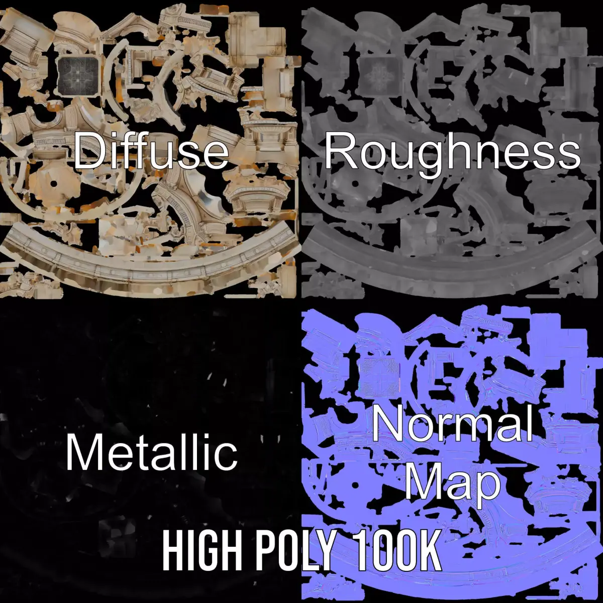 The Regal Marble Fountain model pack features an exquisite design that captures the elegance of classical architecture with its ornate details and majestic figure. Each model comes in three levels of detail: low-poly (1000 triangles for mobile), middle-poly (10,000 triangles for environment), and high-poly (100,000 triangles), allowing versatile use in production rendering with software like 3ds Max, Maya, and Blender, as well as game engines like Unity and Unreal. Ideal for historical recreations, architectural visualizations, and interactive presentations, this model pack provides a choice of detail based on the LOD System principle. Its PBR textures include Diffuse, NormalMap, and reflection/roughness/metallic maps, suitable for any modern rendering engine. All models are accurately unwrapped with no overlapping UVs. Textures are 4096x4096 in size. If you like this model, please give it a like and leave a comment.