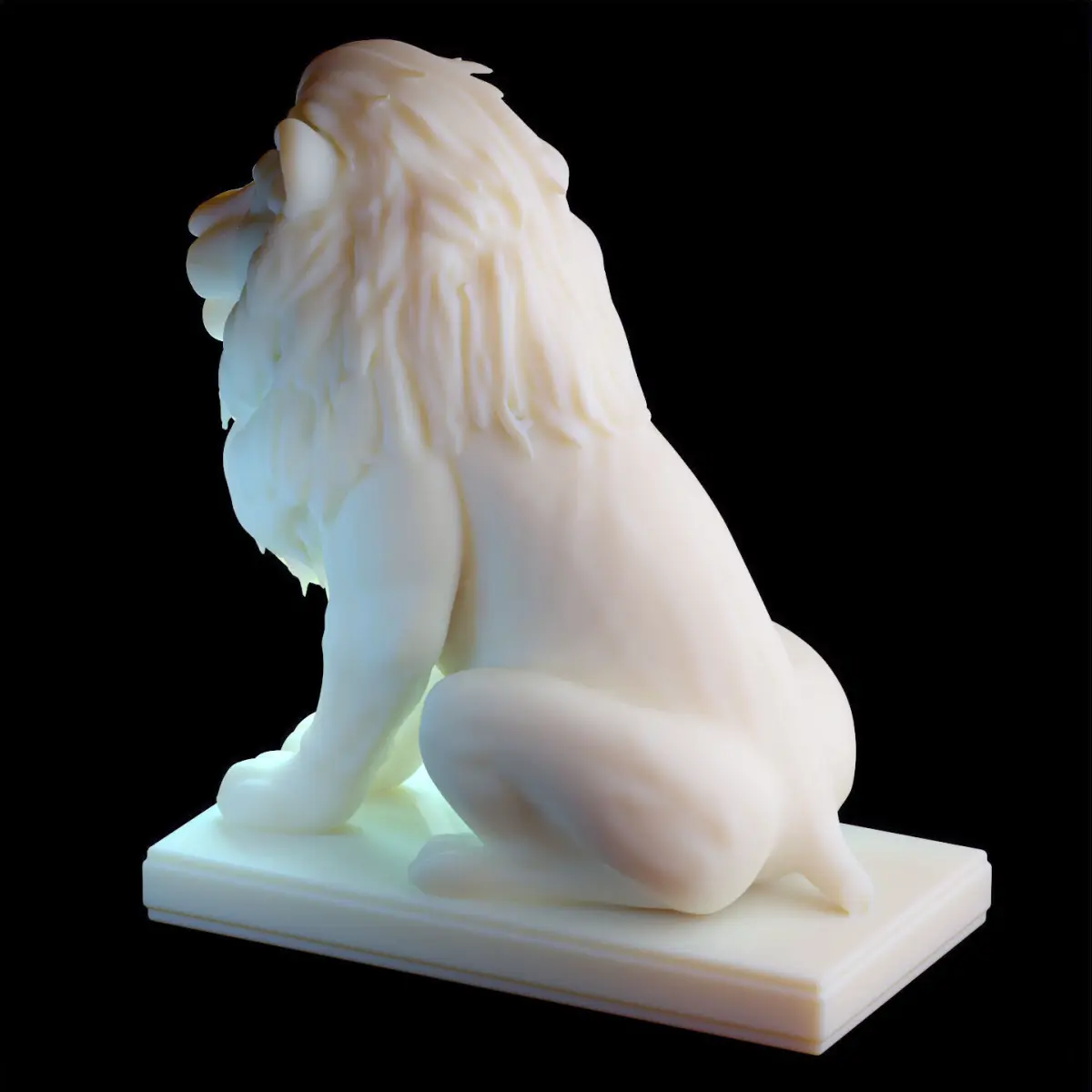 Introducing a striking Seated Lion Statue 3D model, expertly sculpted for 3D printing. This regal lion, perched upright on a rectangular base, showcases detailed anatomical features, a full flowing mane, and a dignified presence – making it perfect for display as a decorative or symbolic object.