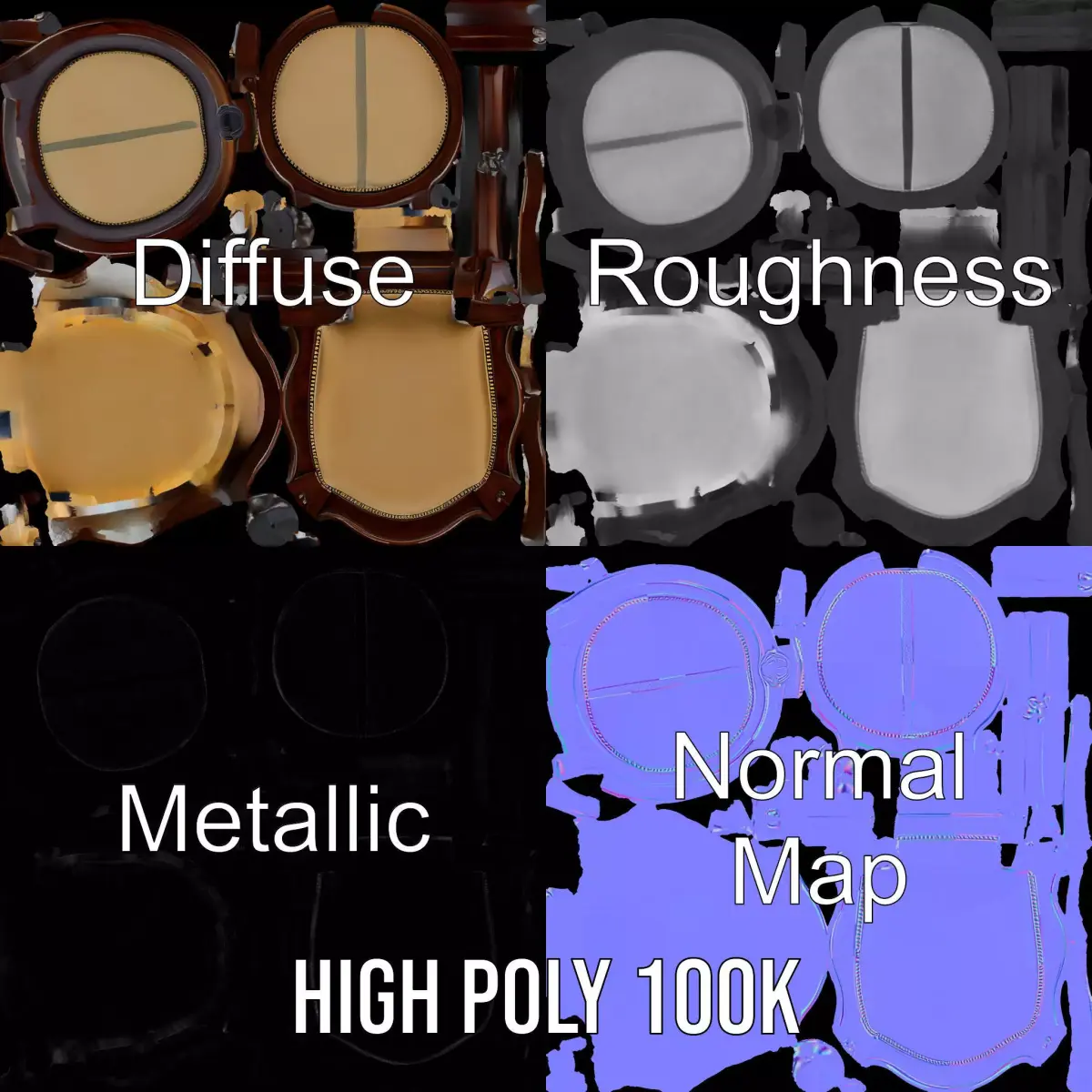 The Regal Walnut Chair model pack epitomizes elegance with its classic silhouette and dark walnut finish. Every detail is meticulously crafted, making it a perfect addition to visually stunning interior scenes or period piece projects. Ideal for use in architectural visualization, cinematic environments, or interactive tours. Each model has 3 levels of detail: low-poly (1000 triangles) for mobile, middle-poly (10,000 triangles) for environment, and high-poly (100,000 triangles) for production rendering (such as 3ds Max, Maya, Cinema4D, Blender, Vray/Corona/Cycles, and more), game engines (Unity and Unreal compatible), and interactive presentations, providing a choice of detail based on the LOD System principle. The model's textures are PBR, Diffuse, NormalMap, and reflection/roughness/metallic, which are suitable for any modern rendering engine. All models are accurately unwrapped and have no overlapping UVs. All textures are 4096x4096 in size. Please like and leave a comment for the model if you enjoyed it.