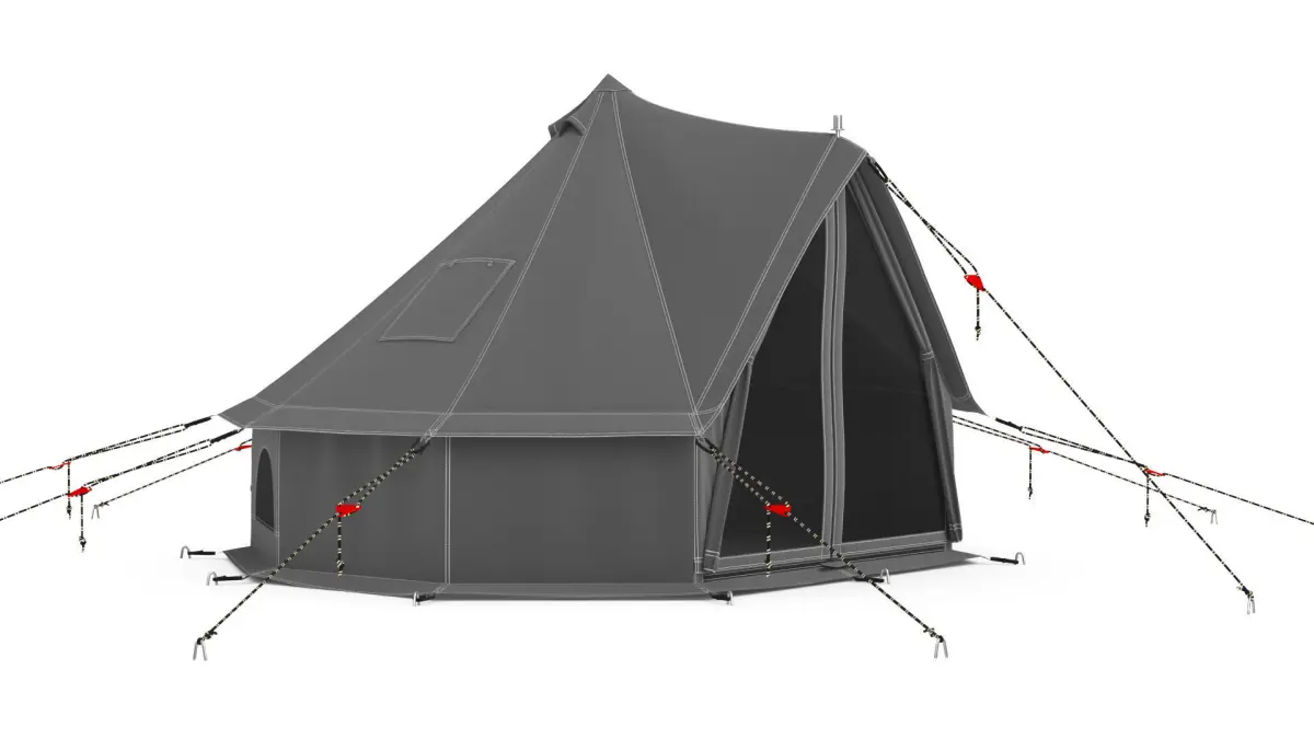 The Regatta Canvas Bell Tent is a high-quality, photorealistic 3D model that adds detail and realism to any rendering project. The model has a fully textured and detailed design, allowing for close-up renders. It was originally modeled in 3ds Max 2016 and rendered with V-Ray. Renders do not undergo postprocessing.