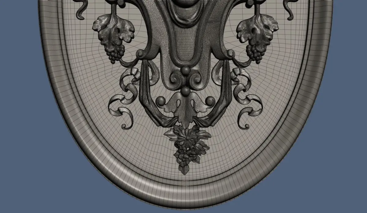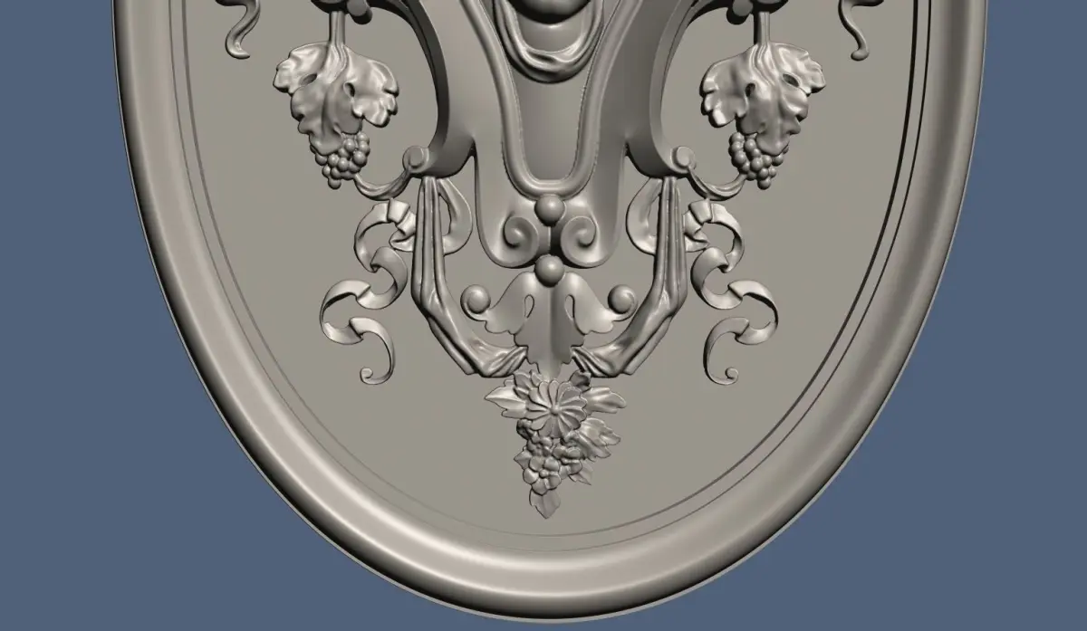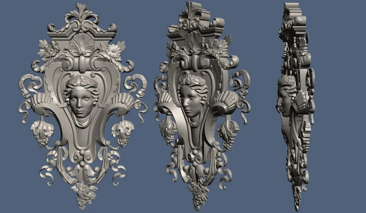Renaissance style decoration with a female face, flowers and other elements.The model includes: