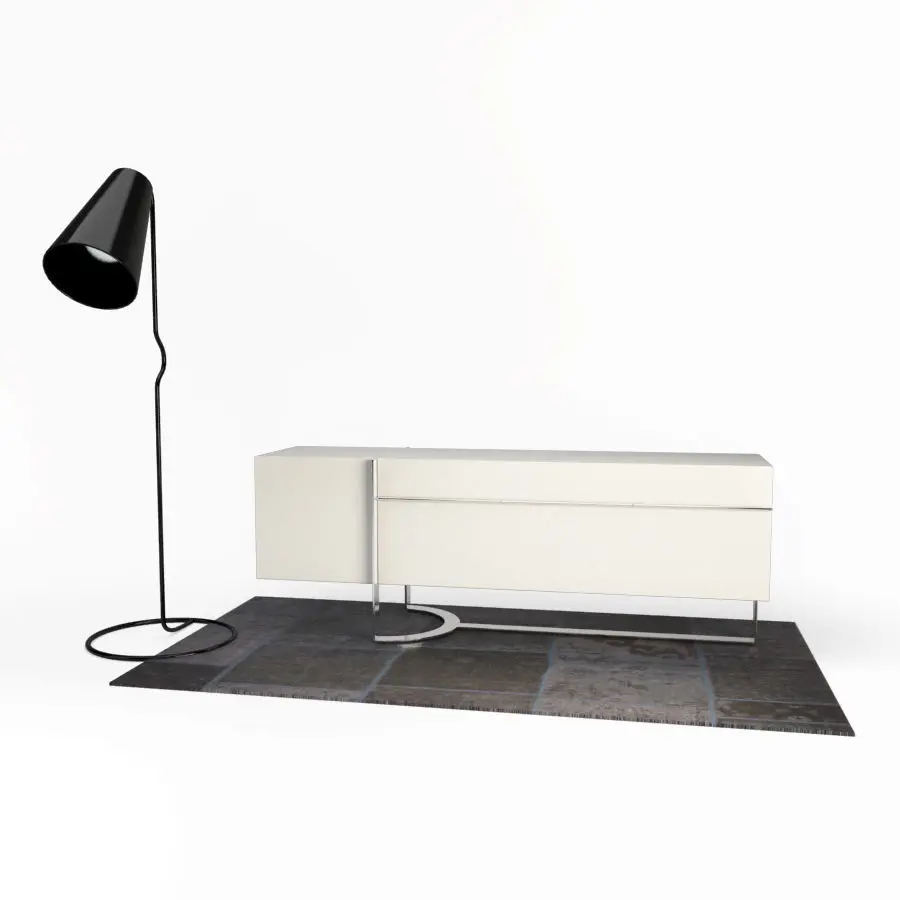 This 3D set includes a leather armchair and footrest, a carpet under a contemporary buffet, a modern floor lamp and a glass coffee table with books.