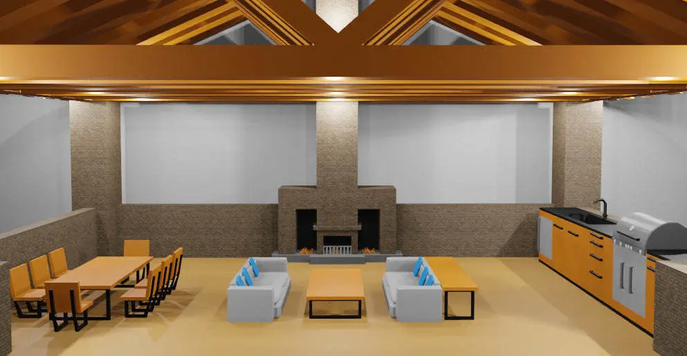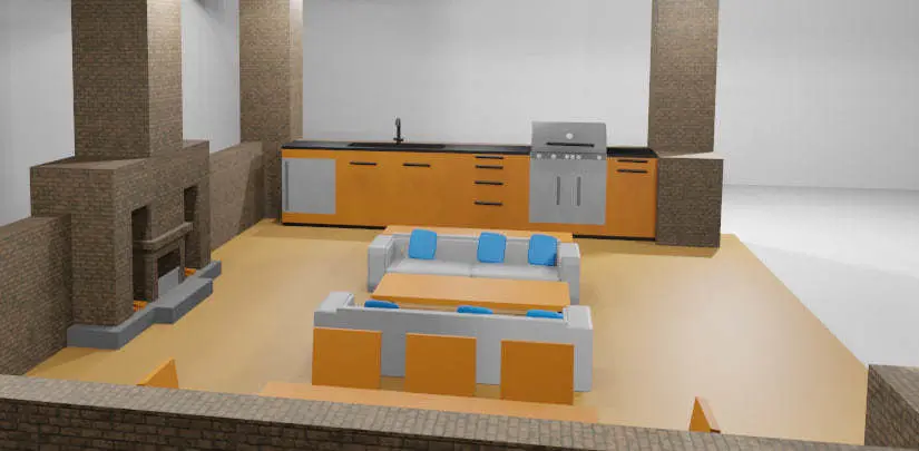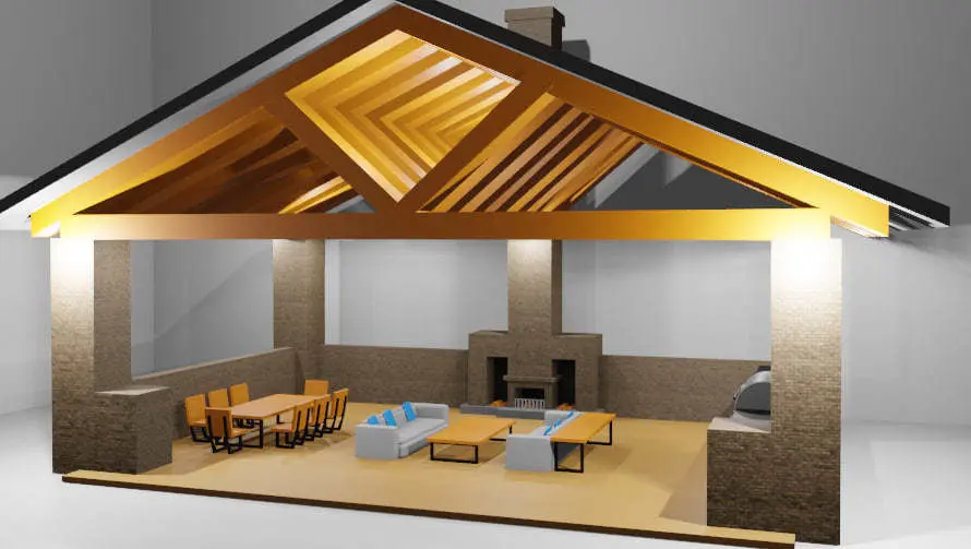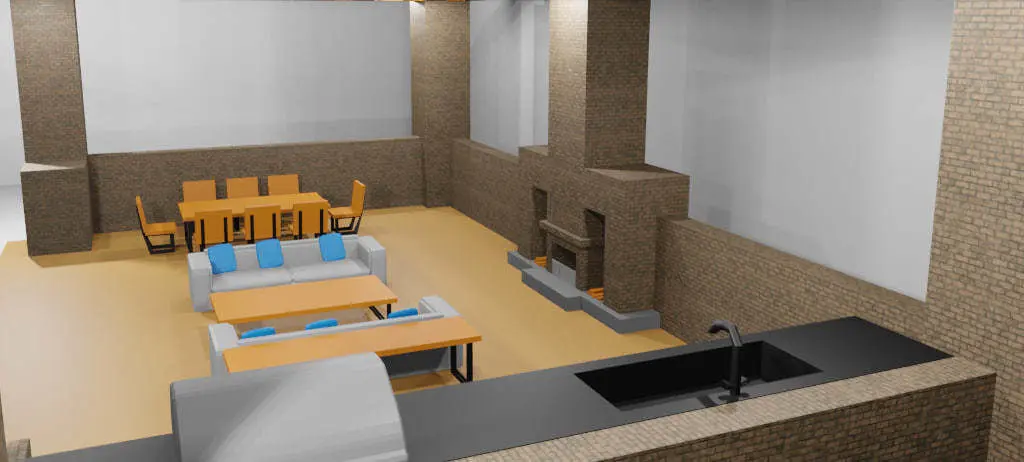 This is a place to relax, it is equipped with an unusual sofa and table. There are also kitchen appliances that we can see, and there is also a unique fireplace in the center