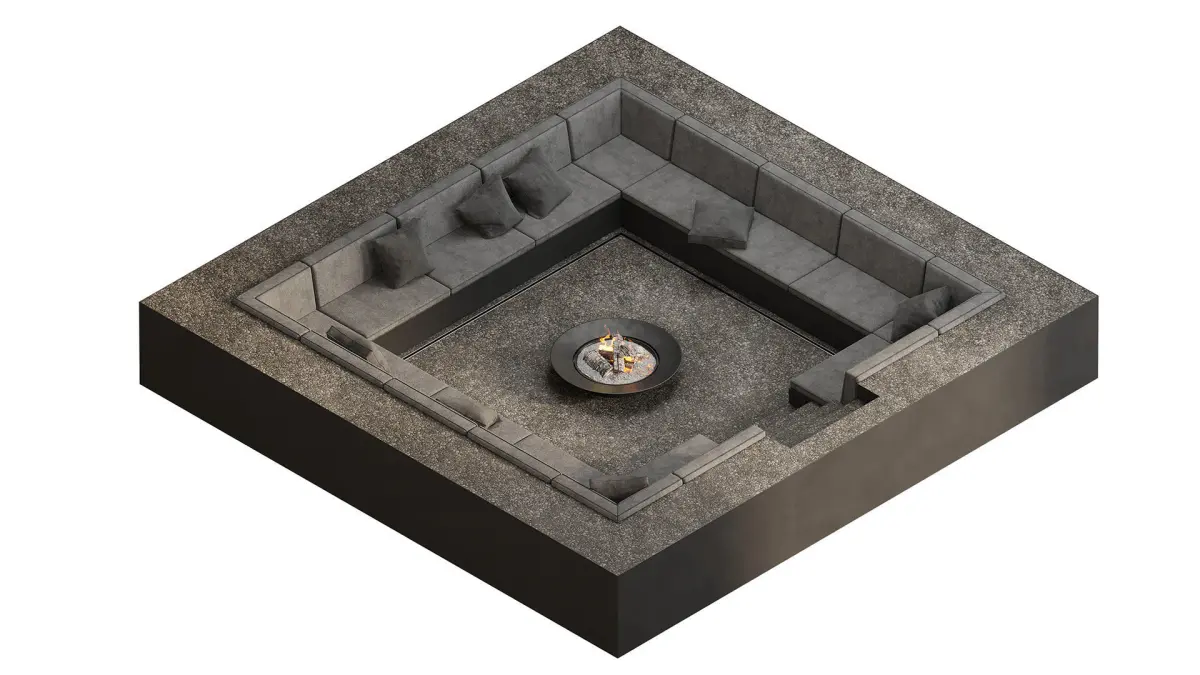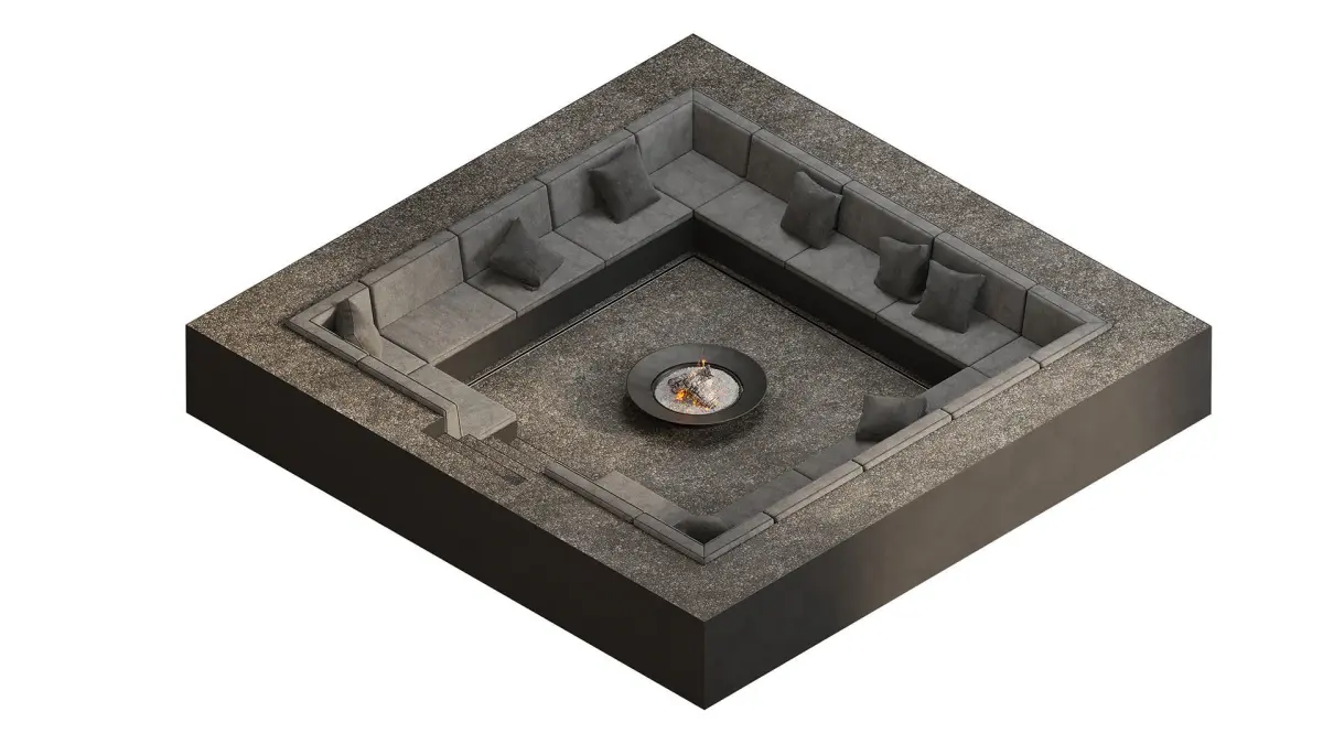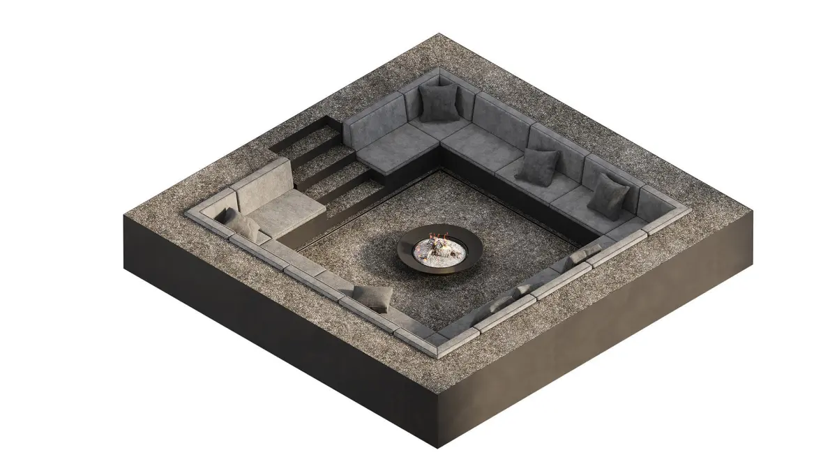 Seating area with sofas and fireplace, sunk into the ground, finished with decorative gravel and metal.