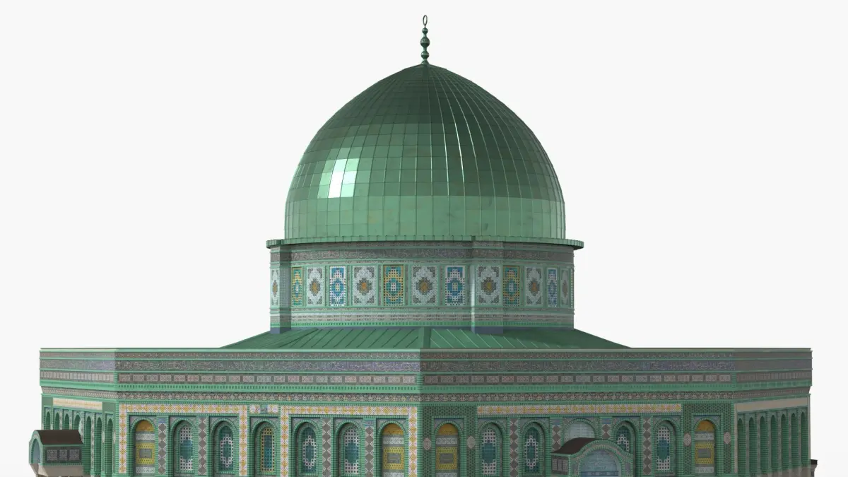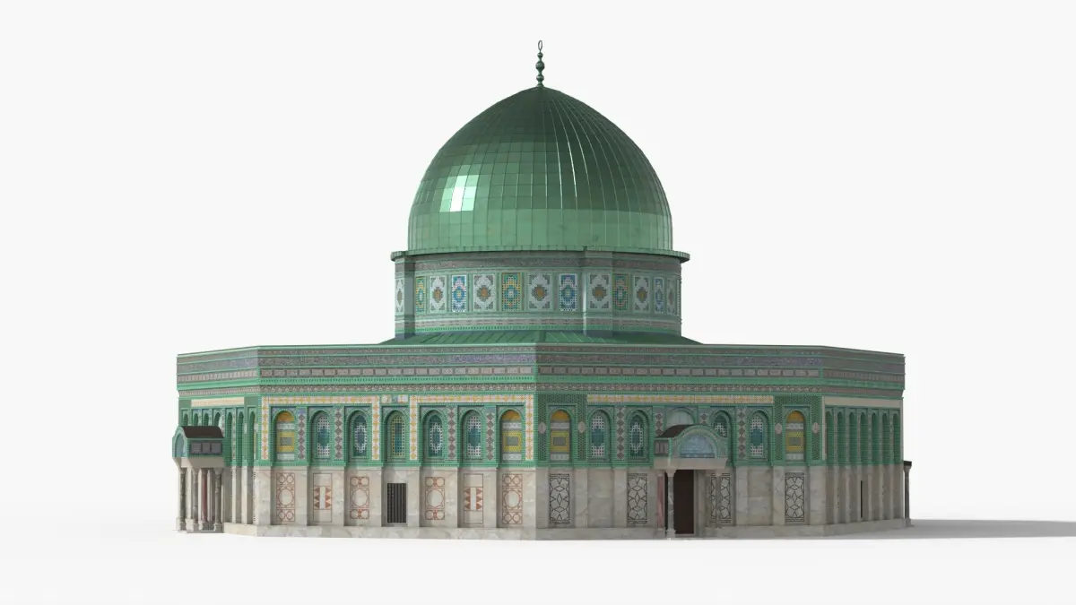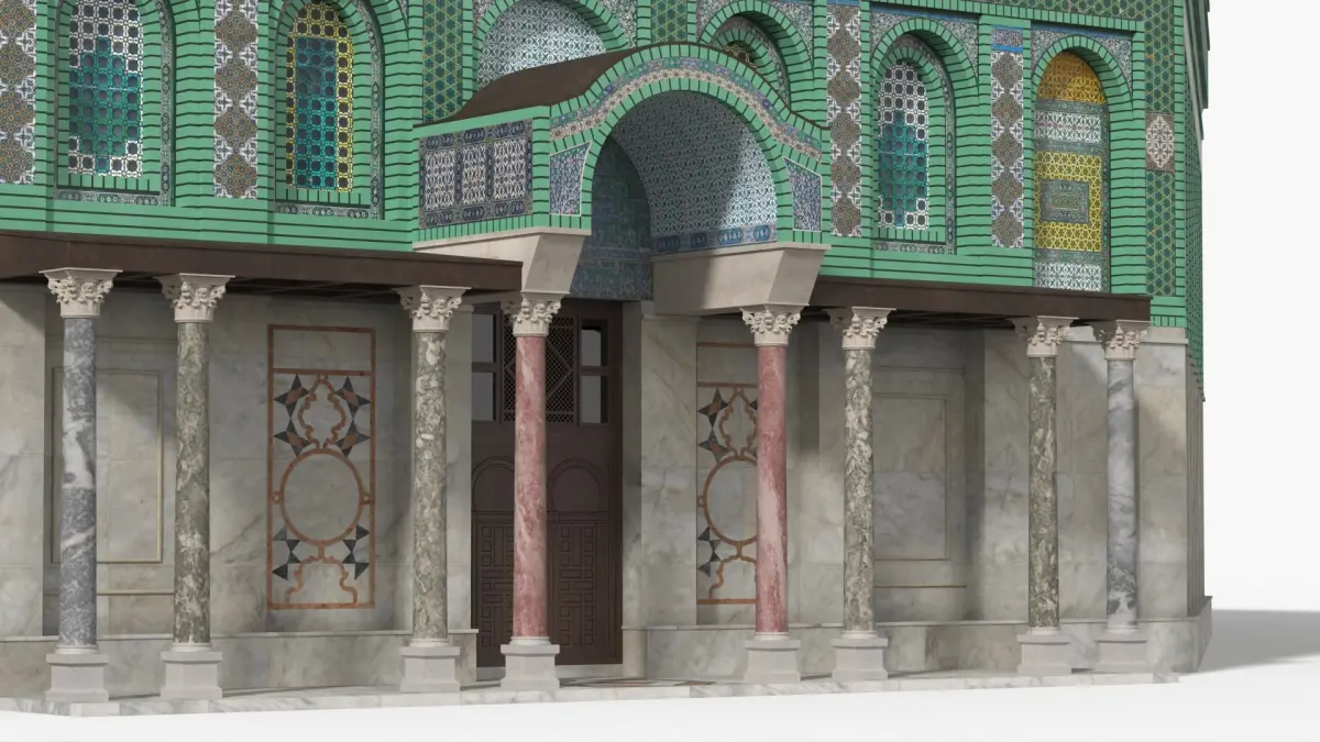 Religious Dome Building with Mosaic Walls Light Green is a three-dimensional model of religious dome building with mosaic walls which is a hypostyle Mosque structure in the form of an octagonal Islamic shrine.
