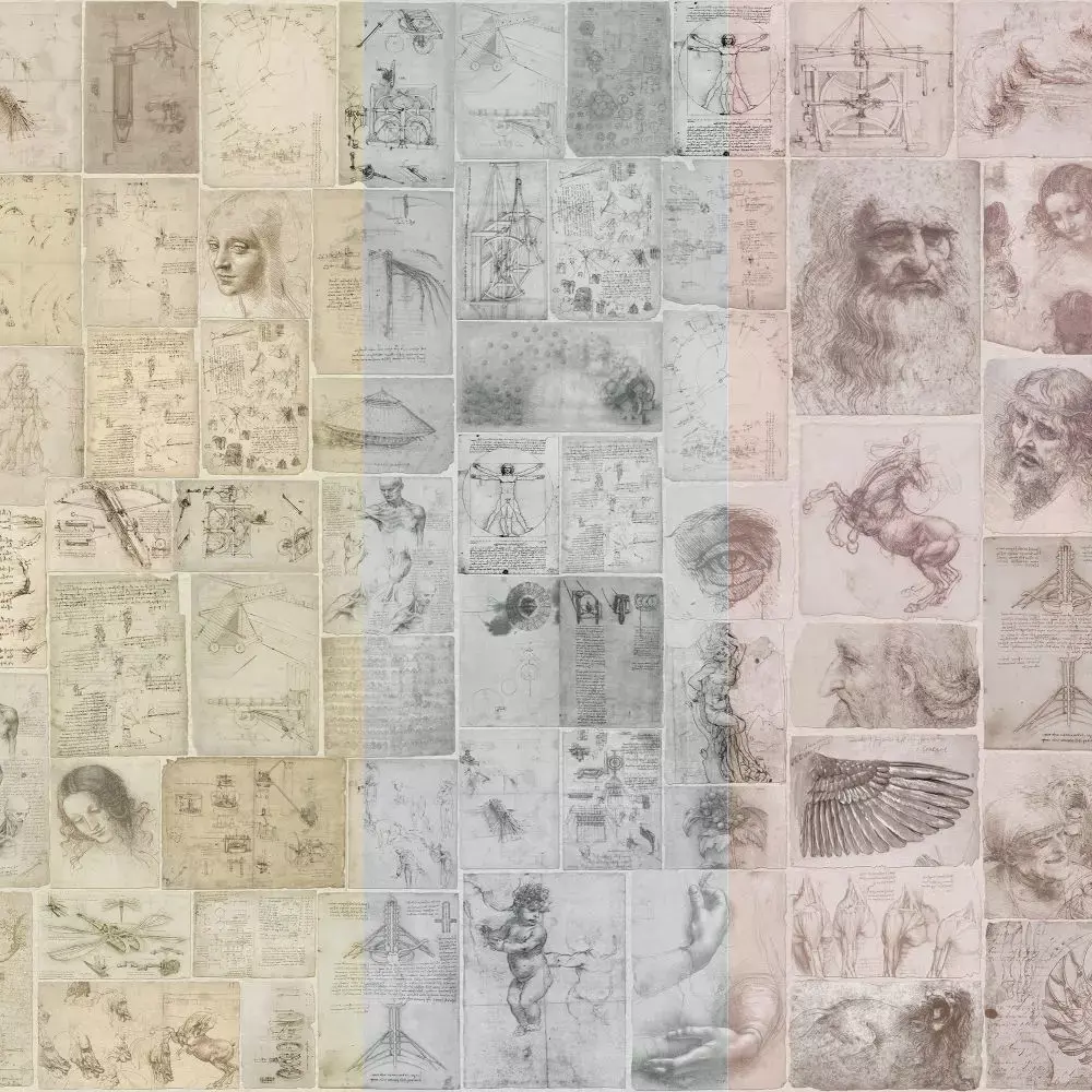What’s includedA seamless collage of aged sketchbook pages featuring anatomical studies, machines, flying wings, and handwritten notes in warm parchment tones, supplied as a high‑resolution texture for full walls and close‑ups.