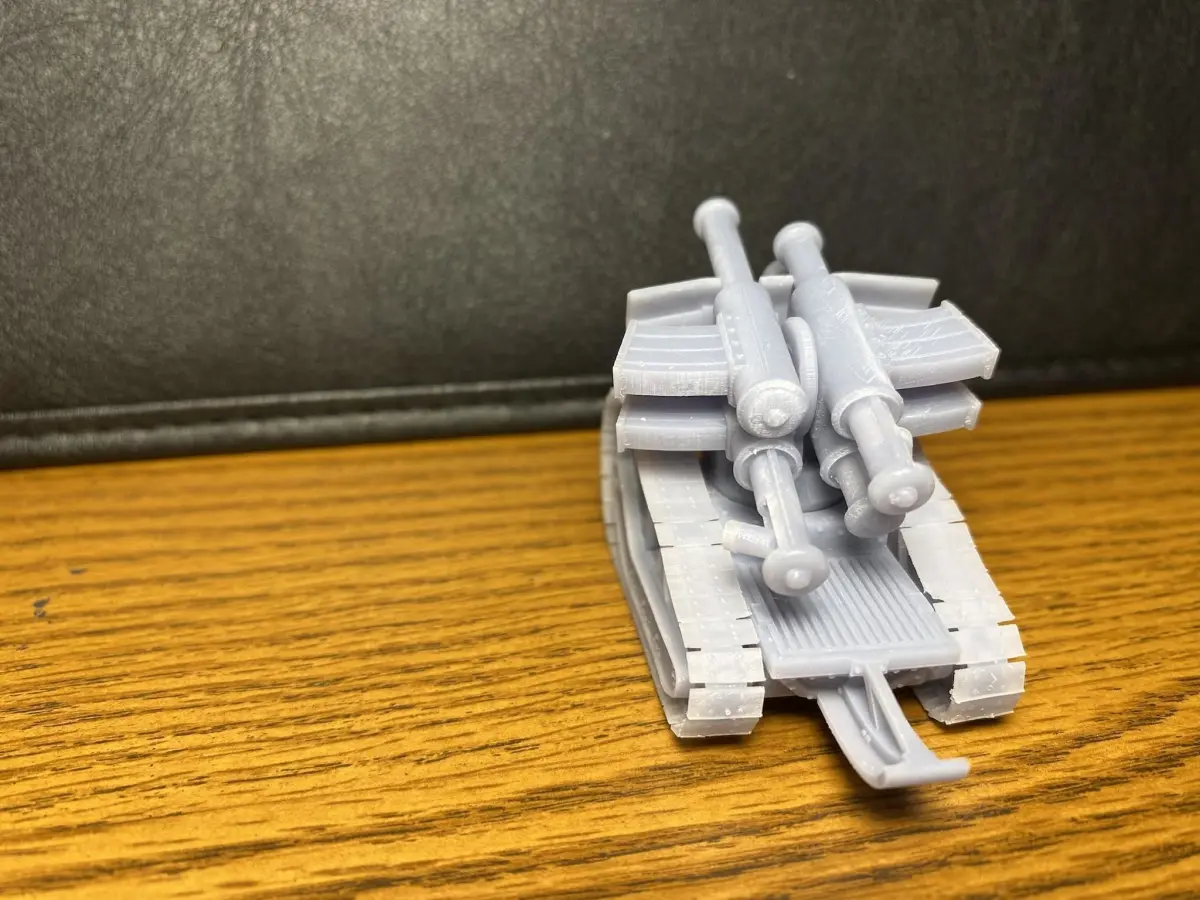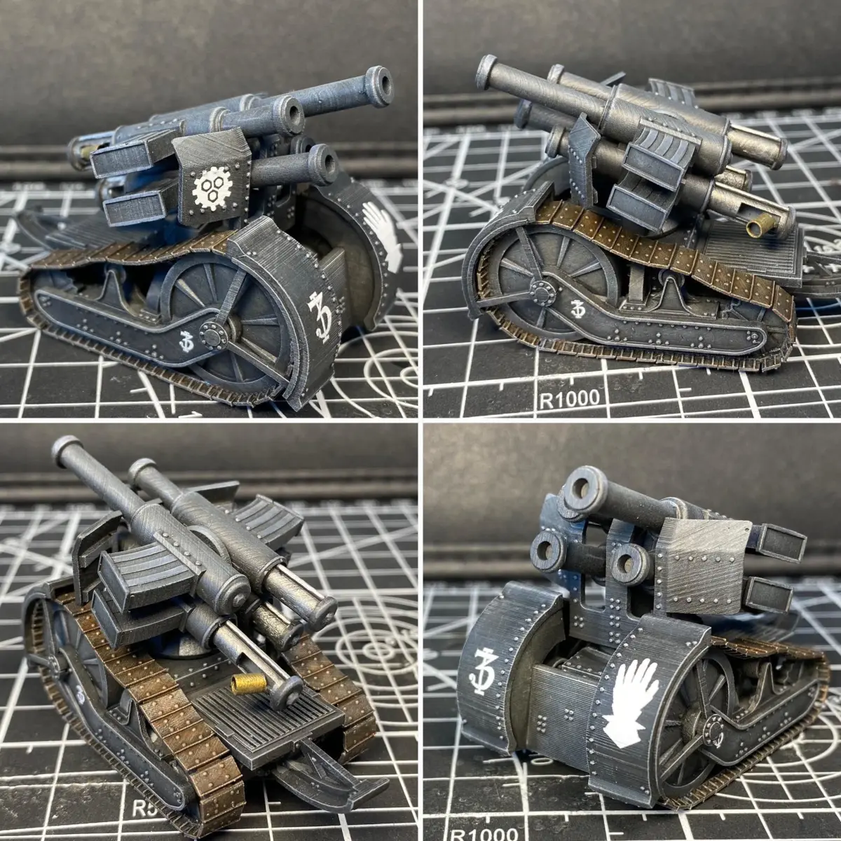 Design Notes: This was inspired by the old-school Thudd gun from the Rouge Trader days. It always bothered me that there were only two magazines that load into the top. Seems like there should be four, amiright? The design was also influenced by the German Whirblewind AA tank's turret. I couldn't choose between the two magazine styles so I made all poses of the main gun with both. My only complaint is that the recoil mechanism keeps the gun from elevating more than 25 degrees. However, this is similar to the original RT-miniature. This should be a suitable stand-in for a Thudd Gun/Heavy Quad Launcher, Rapier Quad Launcher, or maybe even a Thunder-fire cannon.
