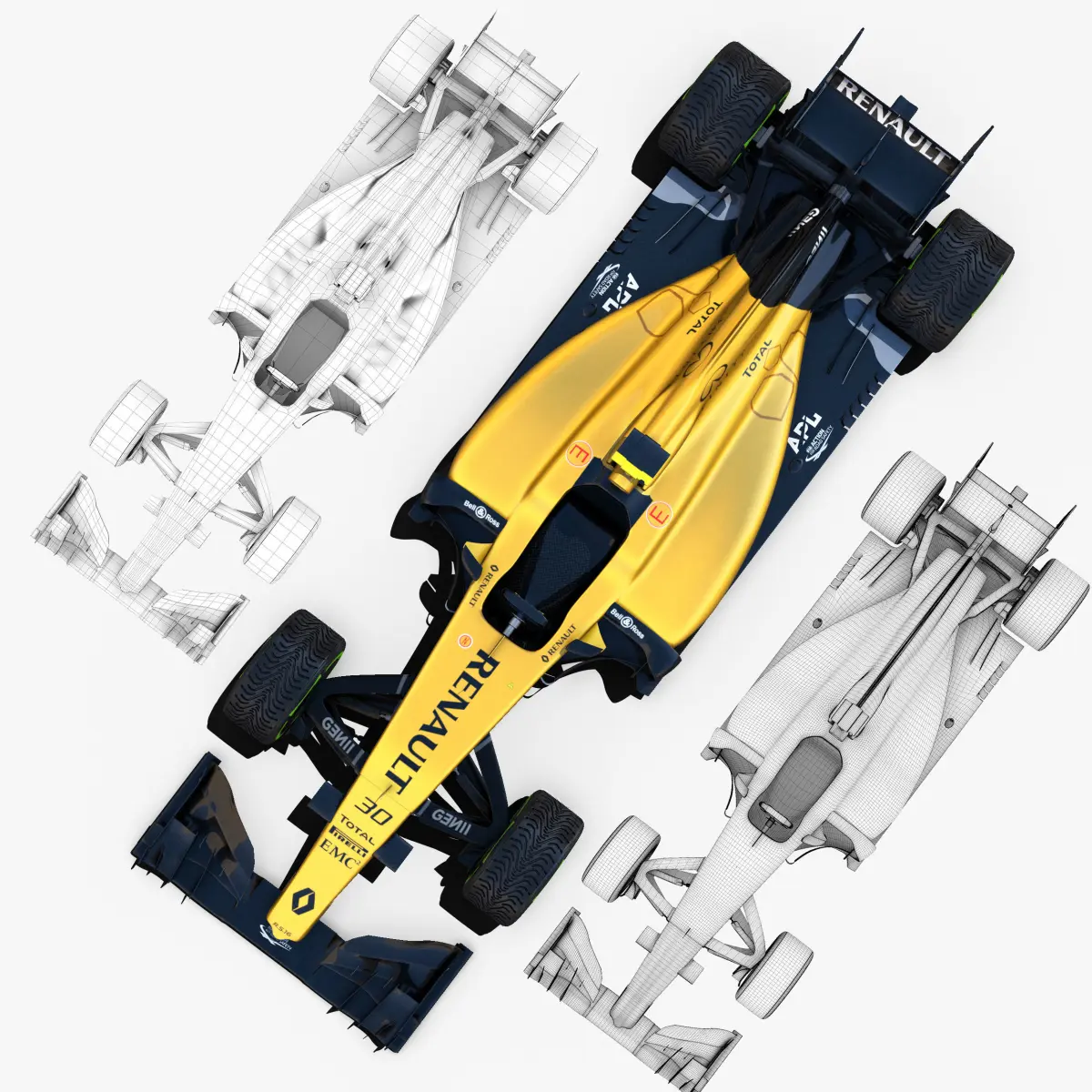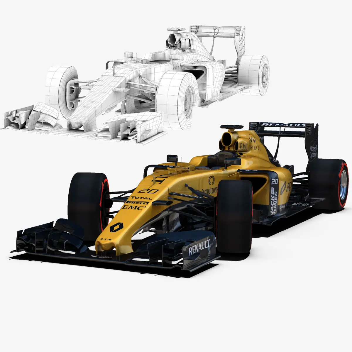 This is a 3D low poly model ,it was designed to provide a high definition in a low poly. Standard low-poly mesh with specific poly count. It`s the most accurate and realistic Renault RS16 of the market. It has all of details of Renault RS16 model. Rigged in the maya version. This is a recreation of Renault RS16 model,it can suffer modification over the season. Included all types os wheels, Kevin Magnussen and Jolyon Palmer textures.The model is completely ready for use visualization in maya. For low poly model simply press 1 and for the high resolution press 3. In Cinema4d go to function menu and subdivide. In 3dmax meshsmooth In the low poly: Poly count : 54050Vertex count : 57062 In the high poly: Poly count : 864800Vertex count : 876539 Textures included. Each texture is in jpg format and have a 4K texture resolution for high quality It has color textures, specular textures, displacement textures,bump textures. The files are obj, fbx, mb ,c4d and 3DS. In formats c4d, 3ds, obj and fbx model exported to standard materials (textures), not contain mental ray shaders. files with the model does not contain extraneous or hidden objects (lights, cameras, etc.). Included rigging and constrains, blend shapes and driven keys only in the maya format. In the maya format you can easily change the wheels, the pilot and the DRS(open and close). original file format maya render in linear sRGB