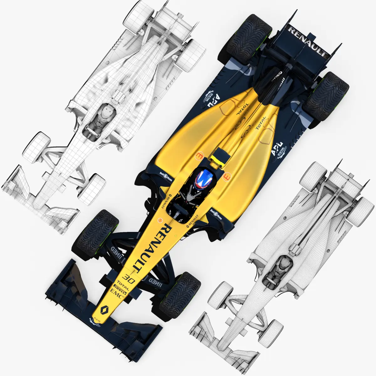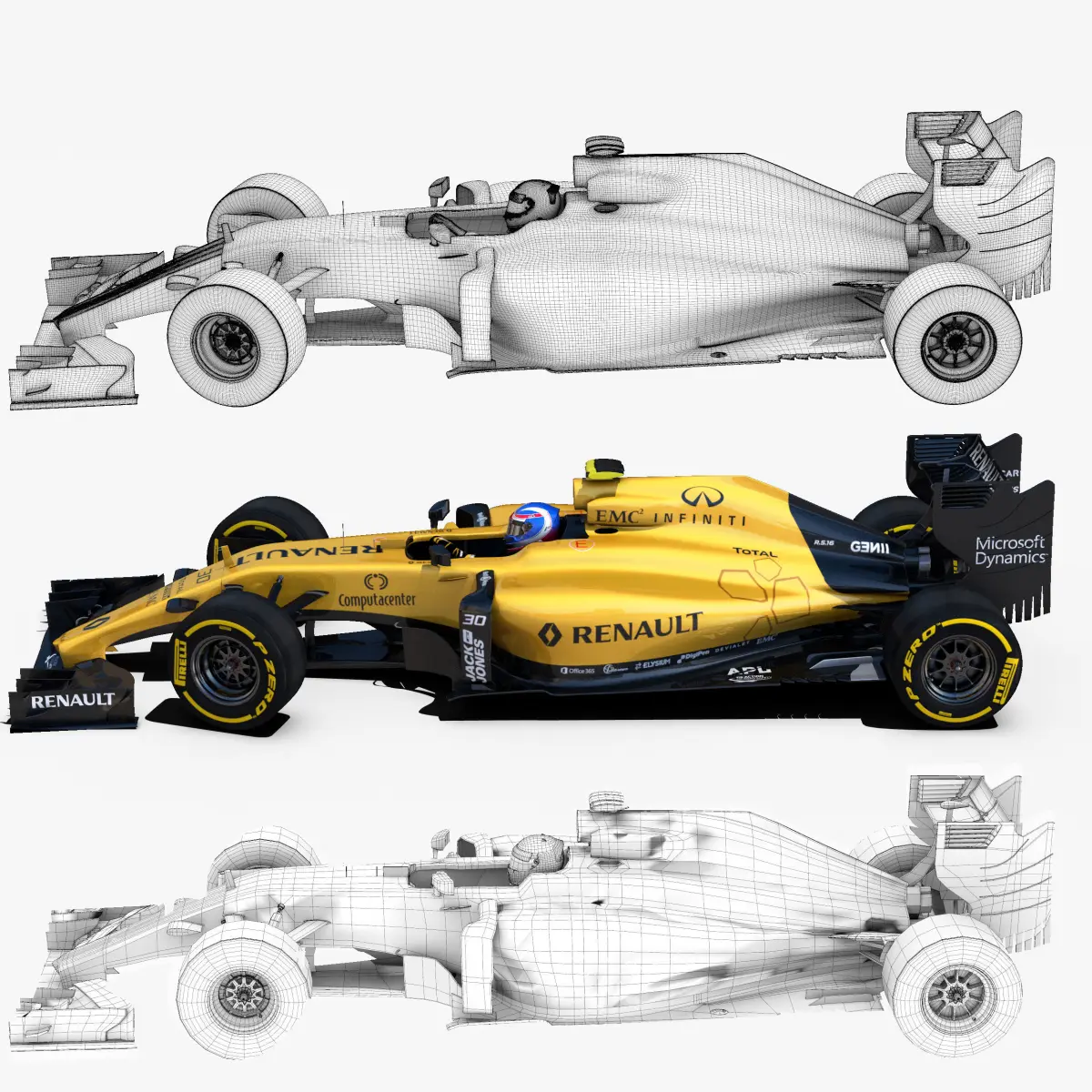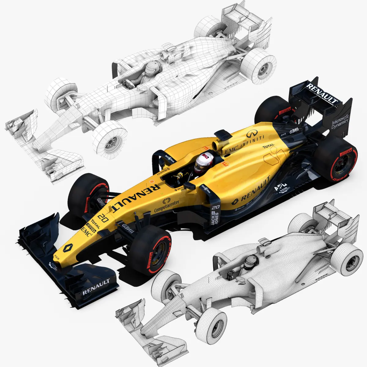 This is a 3D low poly model ,it was designed to provide a high definition in a low poly. Standard low-poly mesh with specific poly count. It`s the most accurate and realistic Renault RS16 of the market. It has all of details of Renault RS16 model. Rigged in the maya version. This is a recreation of Renault RS16 model,it can suffer modification over the season. Included all types os wheels, Kevin Magnussen and Jolyon Palmer, theirs helmets and the steering wheel. The model is completely ready for use visualization in maya. For low poly model simply press 1 and for the high resolution press 3. In Cinema4d go to function menu and subdivide. In 3dmax meshsmooth In the low poly: Poly count : 67354 Vertex count : 71139 In the high poly: Poly count : 1107192Vertex count : 1121935 Textures included. Each texture is in jpg format and have a 4K texture resolution for high quality It has three UV textures, one for the car , other for the tires and the last one for the driver. It has color textures, specular textures, displacement textures,bump textures. The files are obj, fbx, mb ,c4d and 3DS. Included 7 different poses of each driver. In formats c4d, 3ds, obj and fbx model exported to standard materials (textures), not contain mental ray shaders. files with the model does not contain extraneous or hidden objects (lights, cameras, etc.). Included rigging and constrains, blend shapes and driven keys only in the maya format. In the maya format you can easily change the wheels, the pilot and the DRS(open and close). original file format maya render in linear sRGB