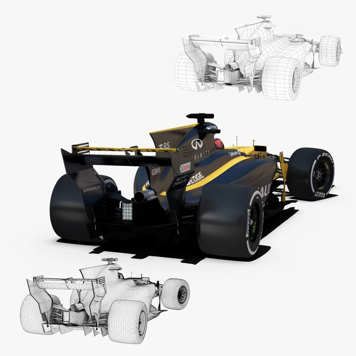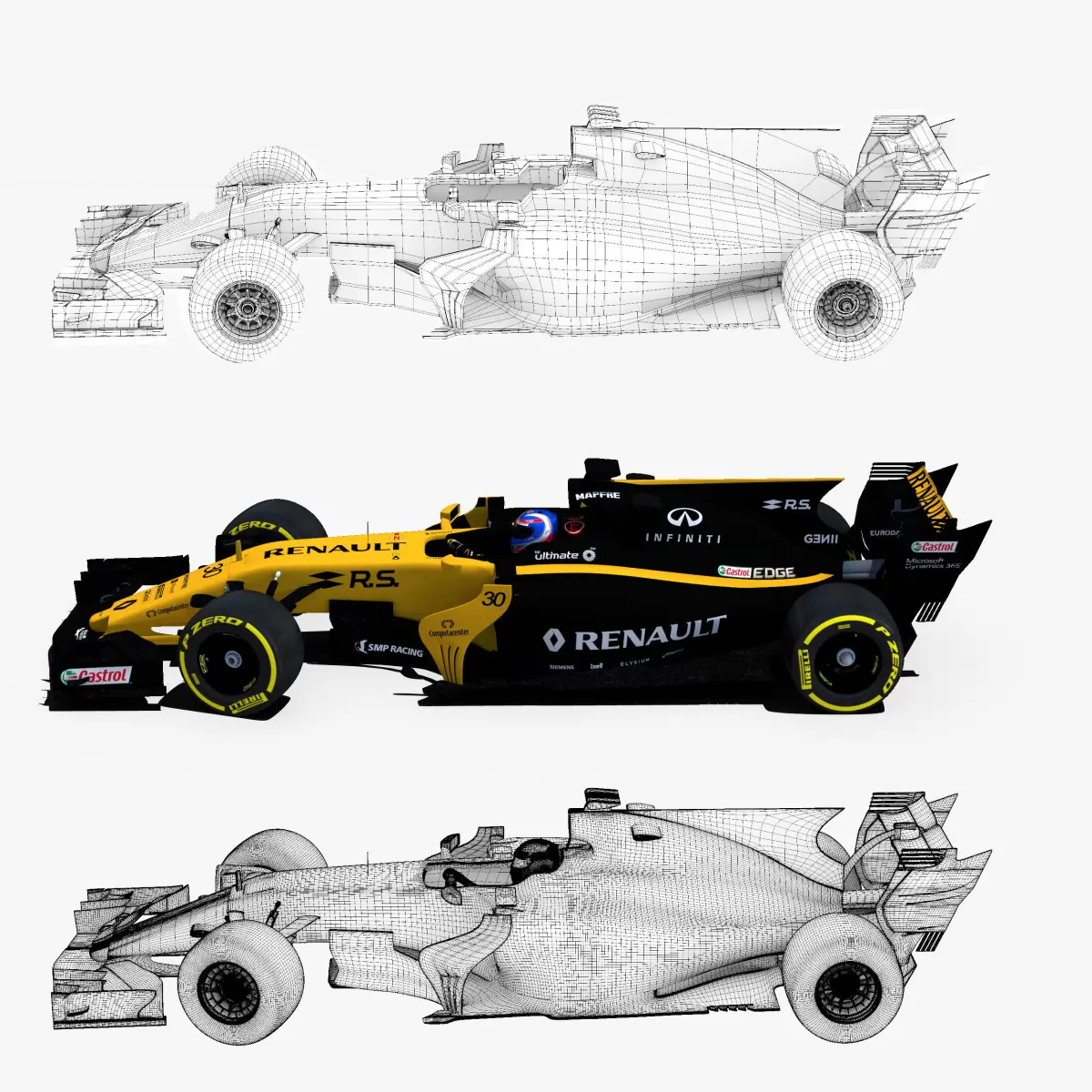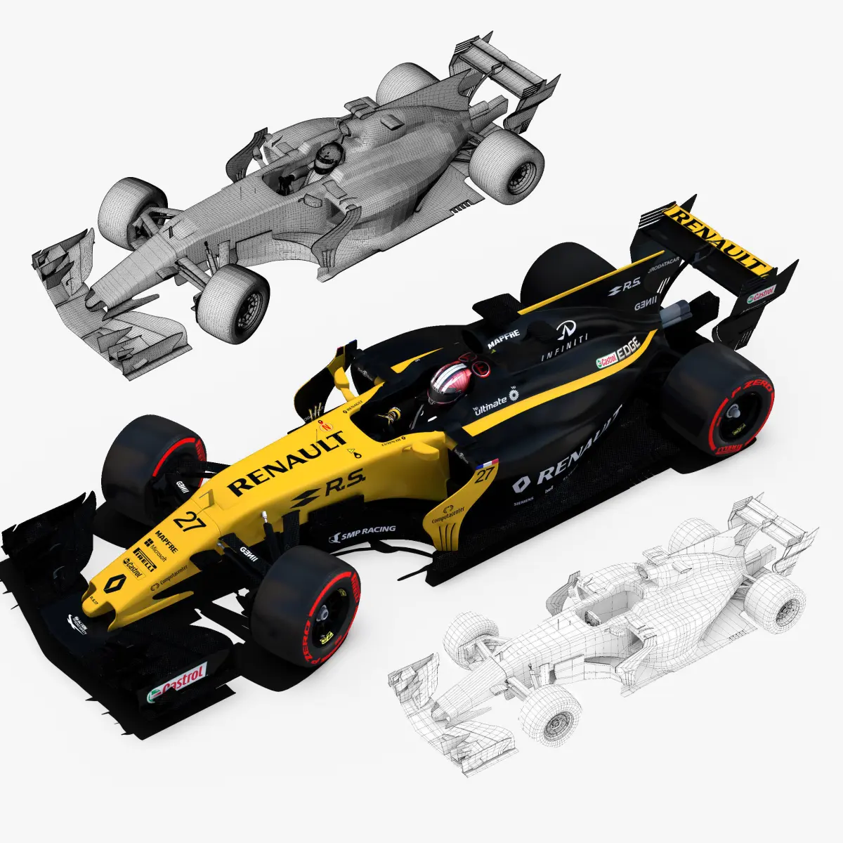 This is a 3D low poly model ,it was designed to provide a high definition in a low poly. Standard low-poly mesh with specific poly count. Rigged in the maya version. In this version joins, control curves, ik handle, blend shapes, different poses, driven key are included . In the other versions only include geometry ( one for each poses),6 poses , materials and textures. Included two drivers and 7 tyres. It`s the most accurate and realistic of the market. This is a recreation of a F1 Car model,it can suffer modification over the season. The model is completely ready for use visualization in maya. For low poly model simply press 1 and for the high resolution press 3. In Cinema4d go to function menu and subdivide. In 3dmax meshsmooth In the low poly: Poly count : 66832Vertex count : 70742In the smooth version: Poly count : 1098864Vertex count : 1114461 Textures included. Each texture is in jpg format and have a 4K texture resolution for high quality It has color,displacement,normal,bump and specular texture Because of different Disk topology at different computers it might be required to change the textures path at the destination computer. The 3D model was created on real base. It's created accurately, in real units of measurement, qualitatively and maximally close to the original. Animation is not included. The files are obj, fbx,max, mb ,c4d and 3DS. In formats c4d, 3ds, obj ,max and fbx model exported to standard materials (textures), not contain mental ray shaders. files with the model does not contain extraneous or hidden objects (lights, cameras, etc.) Included rigging and constrains, blend shapes and driven keys only in the maya format. original file format maya render in linear sRGB Please feel free to contact us for any query or if you need further assistance, we will be happy to assist you.