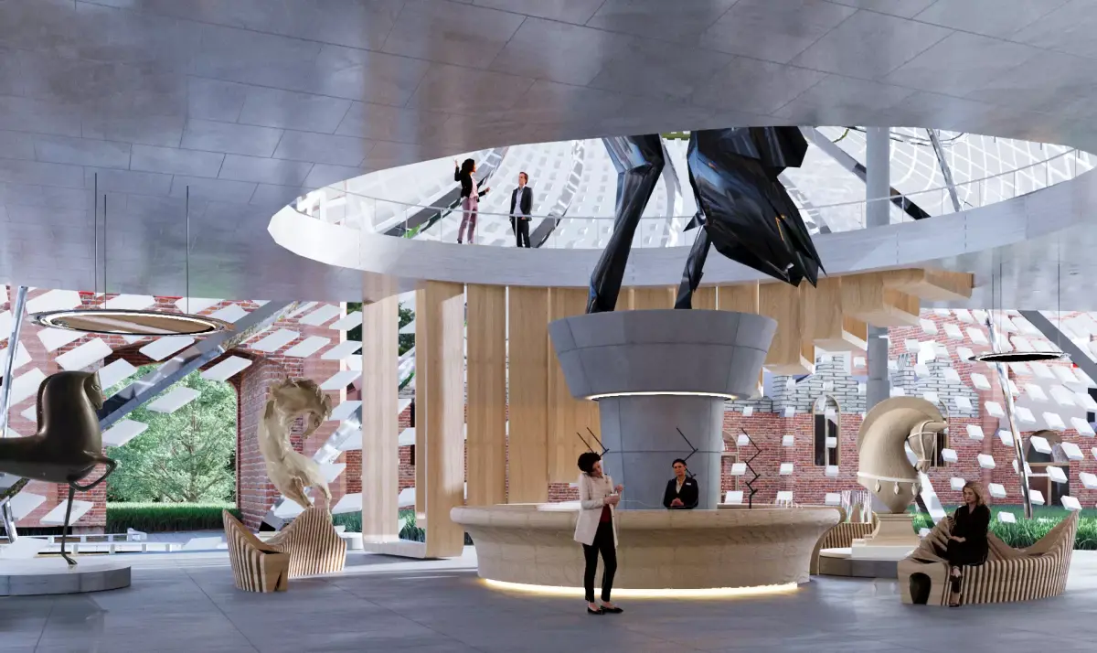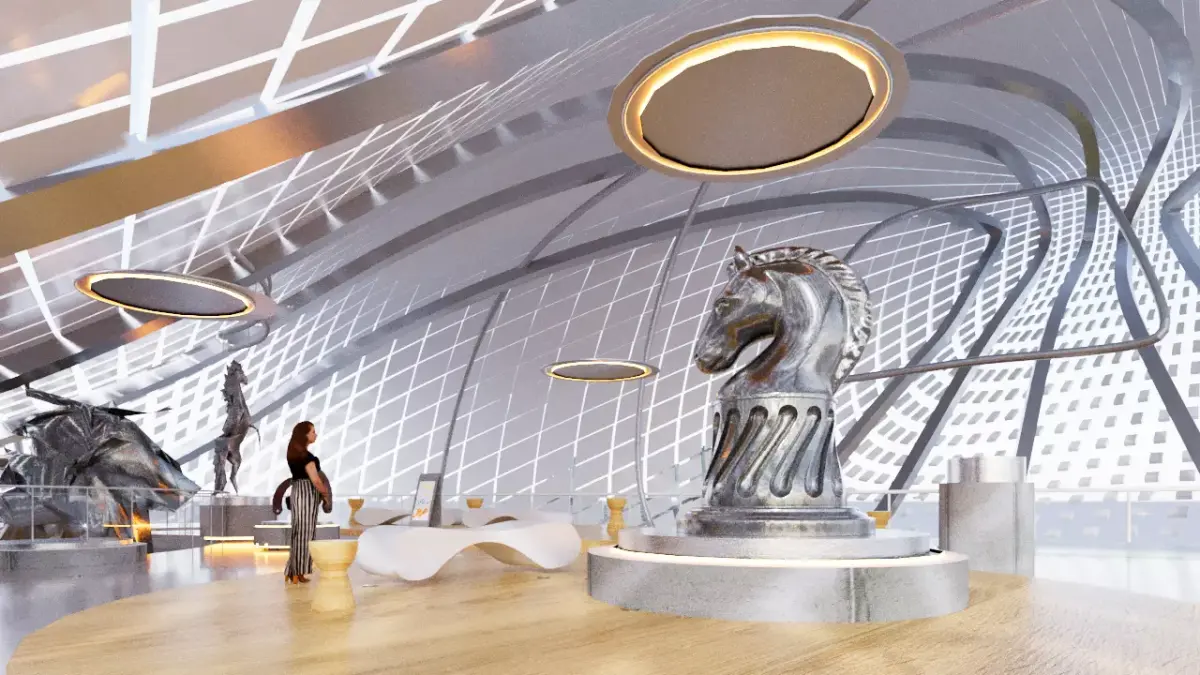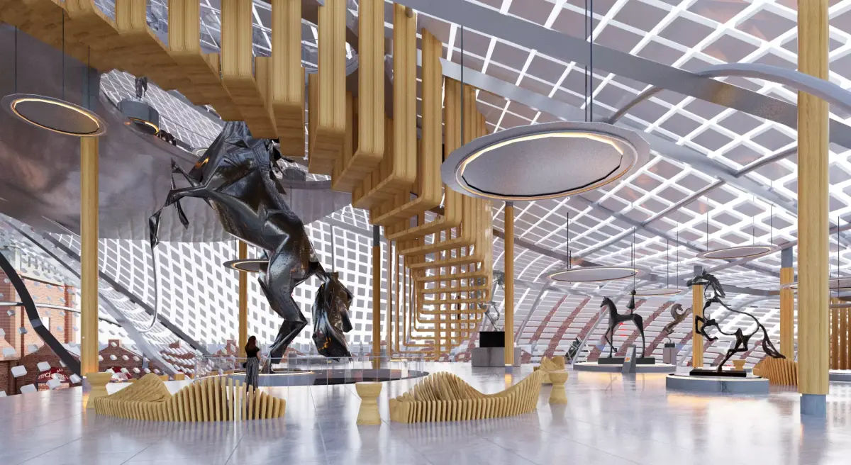 3d architectural and interior visualisation of a recently proposed project that is centered around renovation of Imperial Stables in Peterghof - a town which is close to St. Petersburg. Proposed project includes contruction of a new architectural complex in fluid deconstructivism style, which would be located in inner courtyards and in which new cultural center, museum of local history and souvenir shop would be located. The new building would also house multiple exhibitions of local artists: sculptors, painters, carpenters etc.The whole renovated complex would be three story tall with observation deck located at the third floor, which would open up the view of the whole town and surrounding forests.