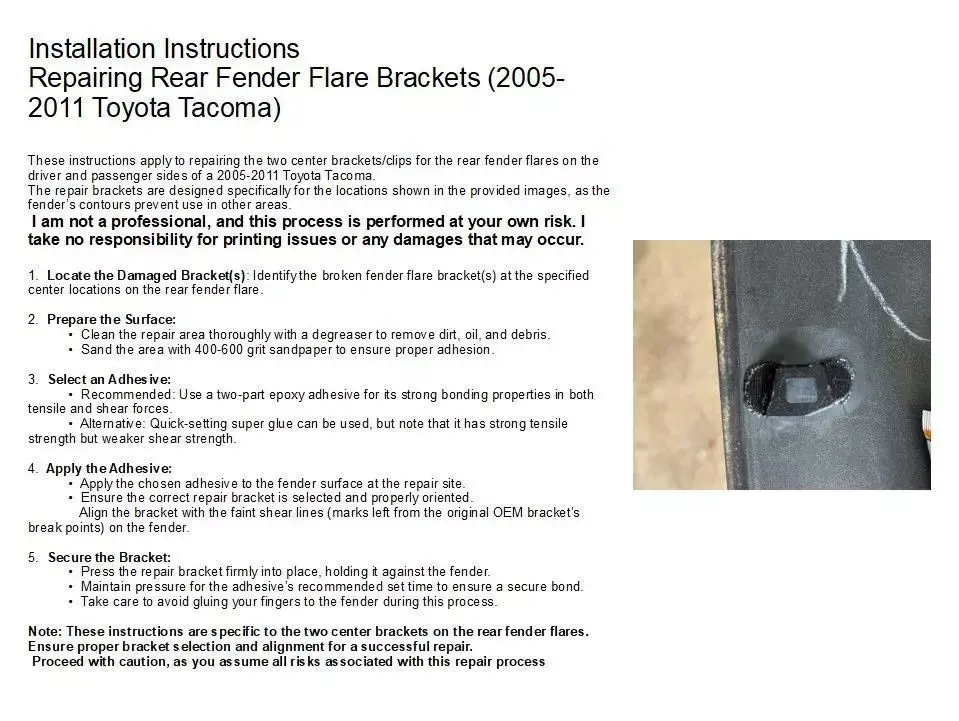 These instructions apply to repairing the two center brackets/clips for the rear fender flares on the driver and passenger sides of a 2005-2011 Toyota Tacoma. The repair brackets are designed specifically for the locations shown in the provided images, as the fender’s contours prevent use in other areas.** I am not a professional, and this process is performed at your own risk. I take no responsibility for printing issues, or any damages that may occur.**