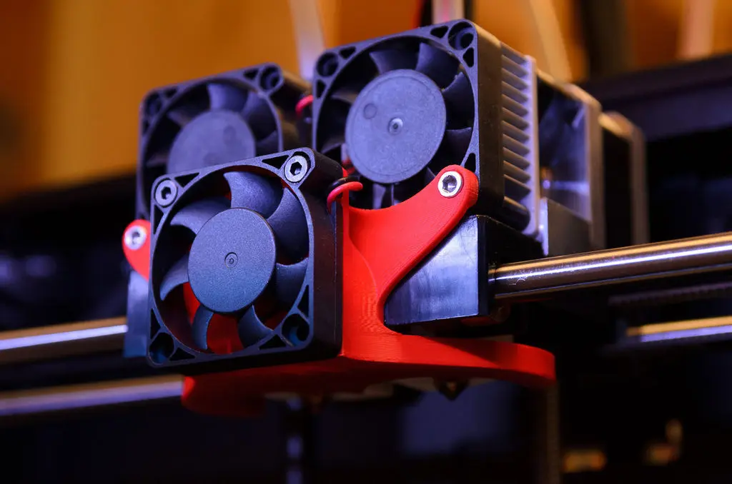 Revision 4 has modified outlets which direct air flow in a more downward direction, and less toward the nozzles. Also, STEP & IGES file formats (R4) are now posted. Made to fit a third 40mm fan for active cooling. The reason I designed this is because I wanted to get air all around the print. Having air coming from just the front was not working well for my needs. Check out some great before and after pictures here: http://www.thingiverse.com/make:75635 This design hugs a little closer to the extruder carriage than some other versions. This keeps it away from the front door hinge bolts! Helpful for PLA and ABS prints. Find the NEW Flash Forge version here: http://www.thingiverse.com/thing:259688