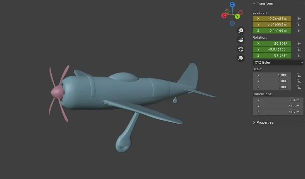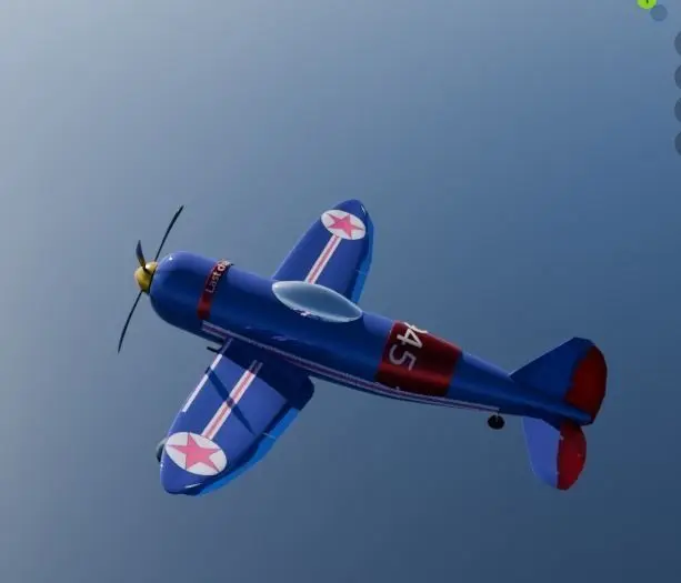 I present my 3D model of a 1945 airplane, created in Blender. This detailed model captures the essence of classic airplanes from that era, featuring an authentic design and a color palette that includes blue and red with white stars, reminiscent of historical military aircraft liveries. The model has a single propeller at the front and realistic dimensions (length: 8.4m, width: 10m).