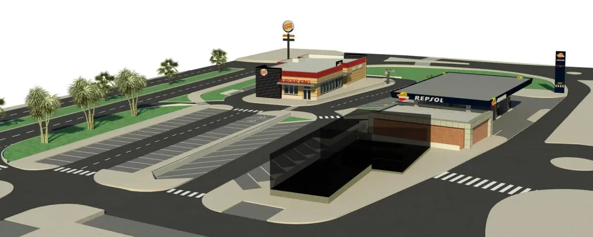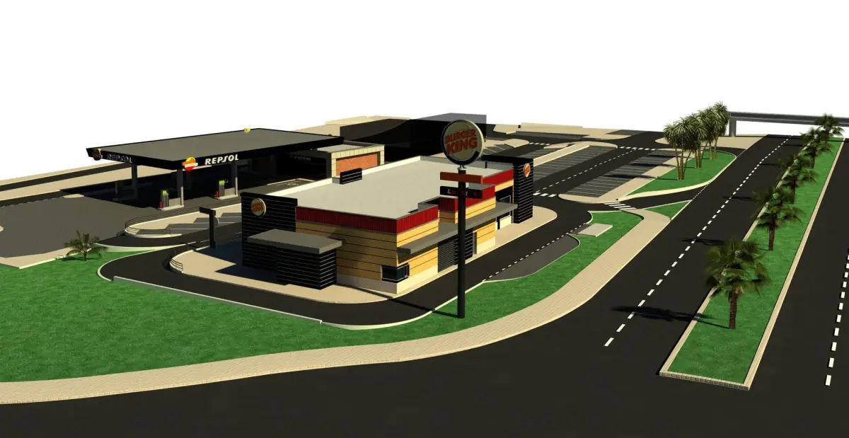 Model of construction for a Gasoline station, Repsol and BurguerKing, make in Revit 2015.Procedual Material in Revit.All the Revit family librarie are parametric.