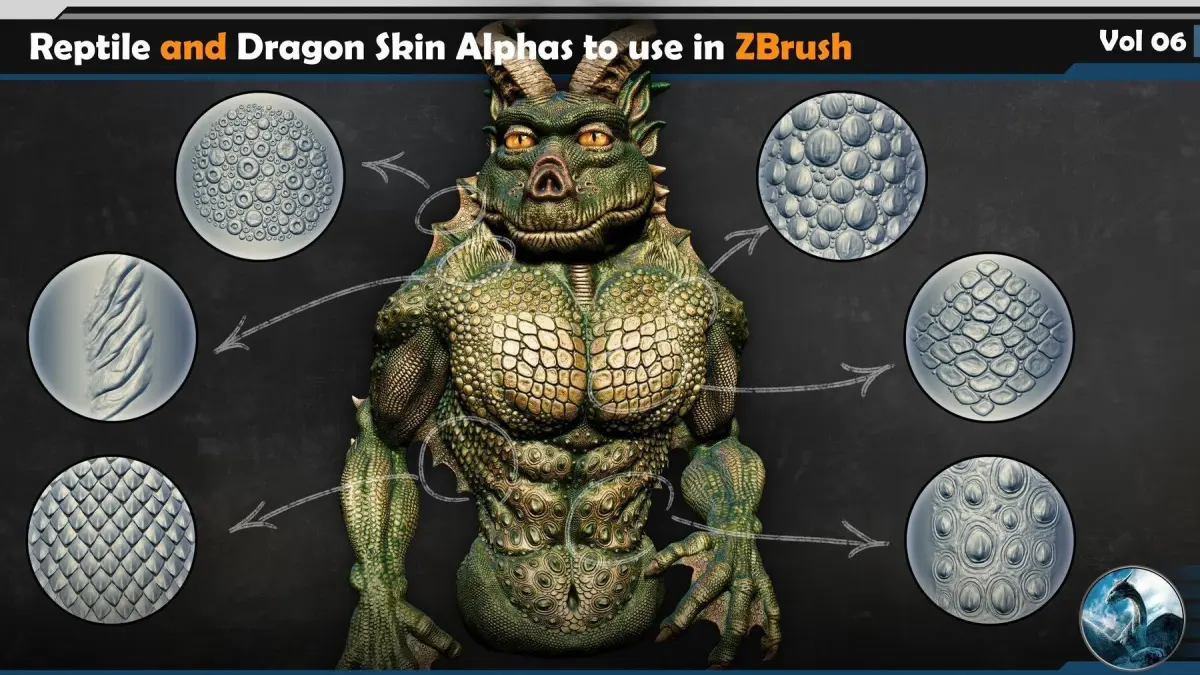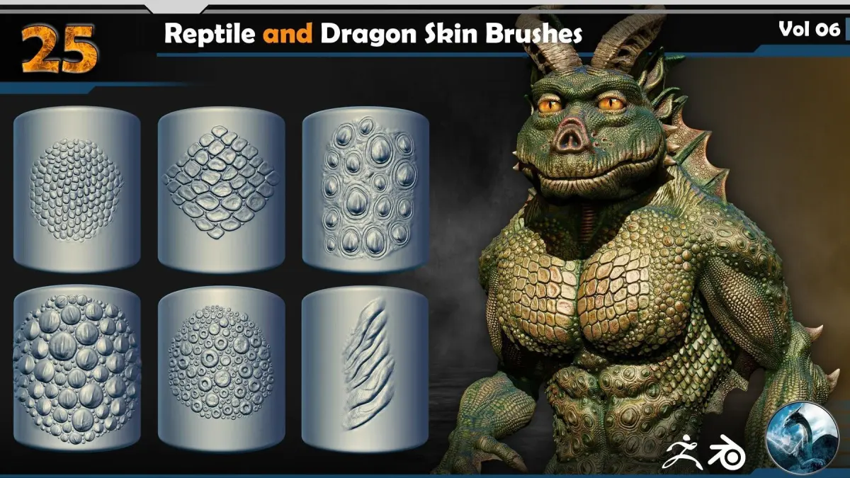 This Product include ** 25 Reptile and Dragon Skin Brushes Vol 06**This product enables you to complete any creature or animal model, fill all the body levels of the characters, for example you can watch the preview video and enjoy.