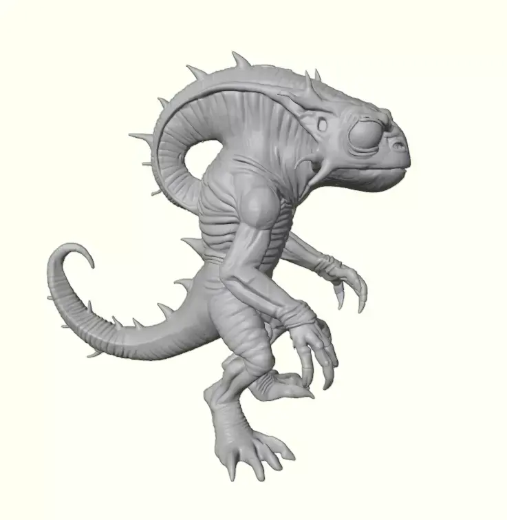 The Reptilian Stalker is an alien-inspired creature design, blending reptilian traits with otherworldly physiology. Standing upright with a lizard-like build, it has muscular limbs, clawed hands, and a long tail for balance. Its most striking feature is the frilled crest around its neck, lined with sharp spines, giving it a menacing and predatory silhouette. Large, glossy eyes and scaled skin add to its unsettling, extraterrestrial appearance.