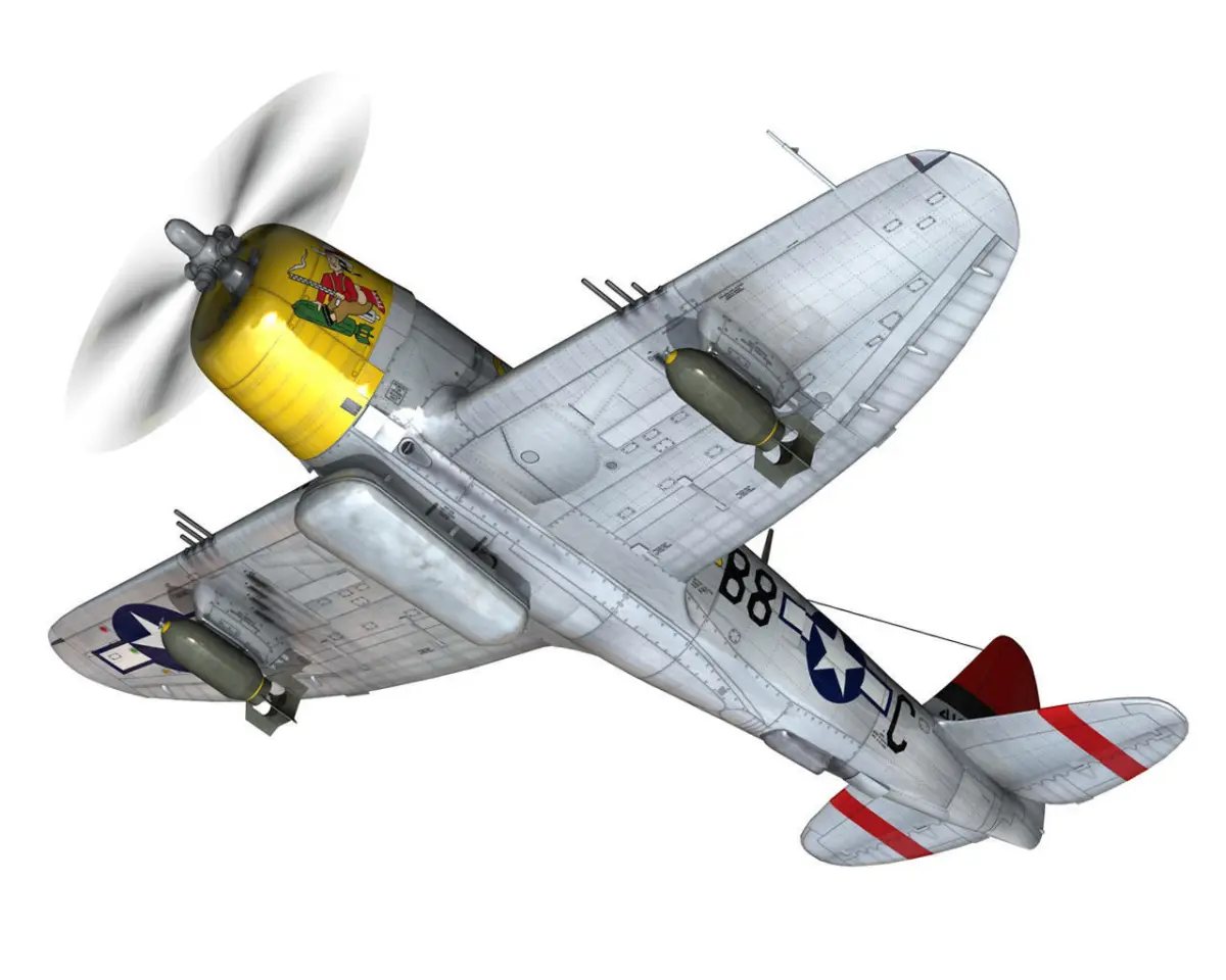 The Thunderbolt was the most famous of all the Republic aircraft in WWII. First flown on 6 May 1941, the P-47 was designed as a large, high-performance fighter/bomber, utilizing the large Pratt and Whitney R-2800 Double Wasp engine to give it excellent performance and a large load-carrying capability. The first deliveries of the P-47 took place in June 1942, when the US Army Air Corps began flying it in the European Theater.