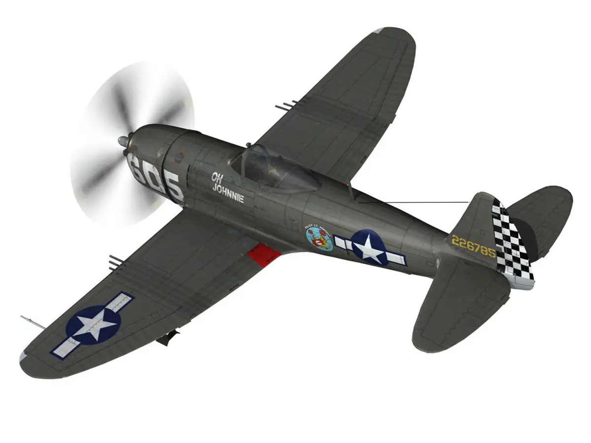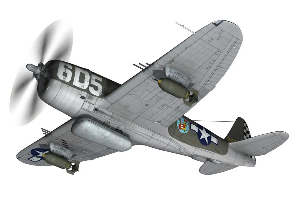 The Thunderbolt was the most famous of all the Republic aircraft in WWII. First flown on 6 May 1941, the P-47 was designed as a large, high-performance fighter/bomber, utilizing the large Pratt and Whitney R-2800 Double Wasp engine to give it excellent performance and a large load-carrying capability. The first deliveries of the P-47 took place in June 1942, when the US Army Air Corps began flying it in the European Theater.