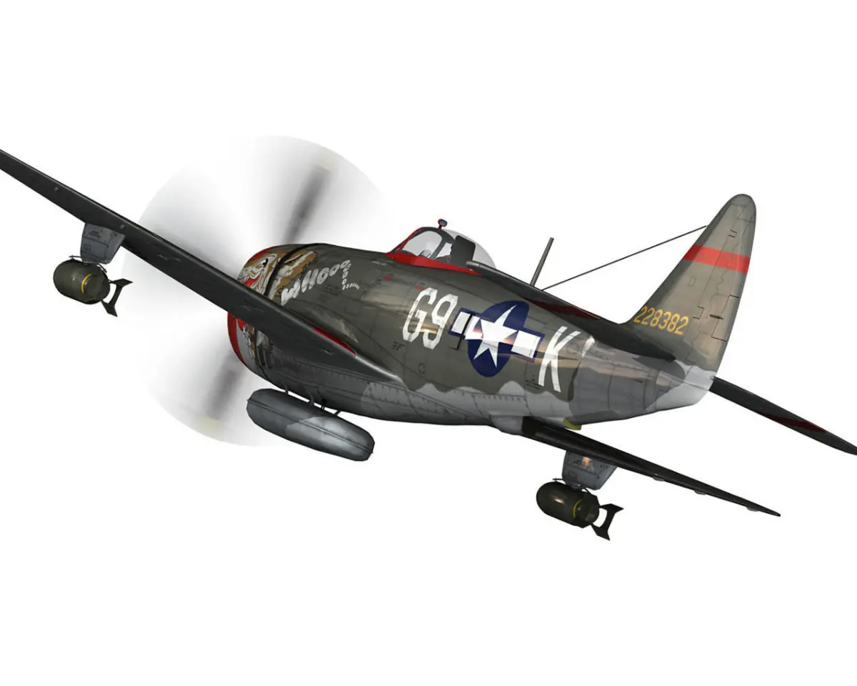 The Thunderbolt was the most famous of all the Republic aircraft in WWII. First flown on 6 May 1941, the P-47 was designed as a large, high-performance fighter/bomber, utilizing the large Pratt and Whitney R-2800 Double Wasp engine to give it excellent performance and a large load-carrying capability. The first deliveries of the P-47 took place in June 1942, when the US Army Air Corps began flying it in the European Theater.