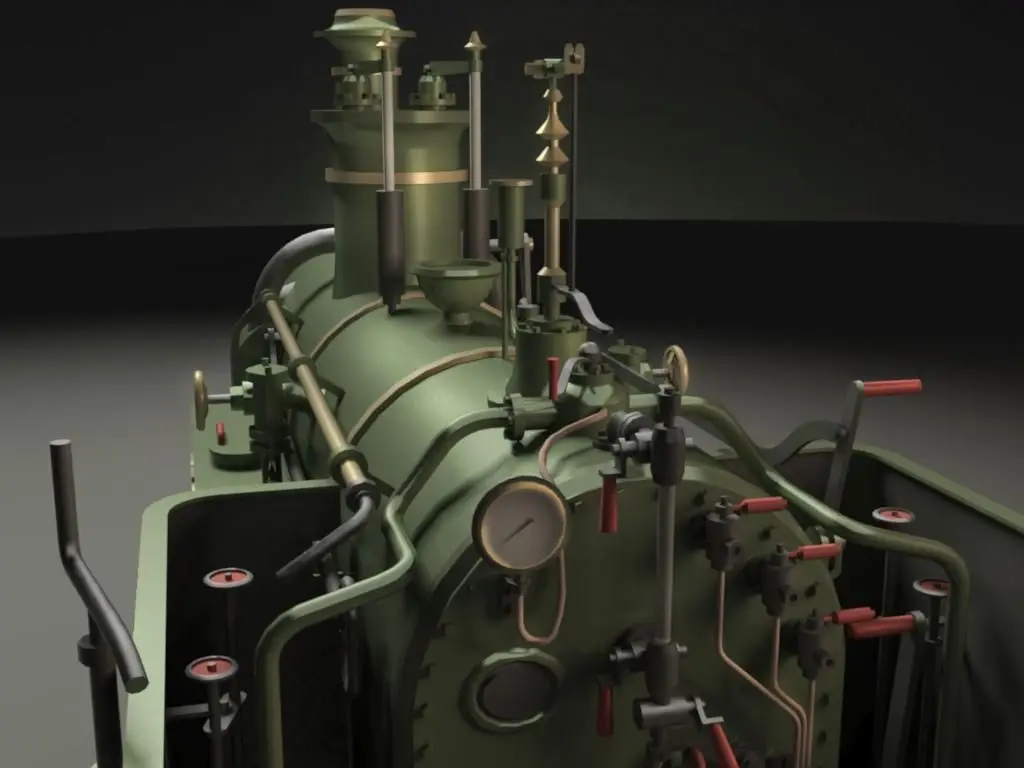 Scale model contains several arch&design as well as a few standard materials. Three lights are included in the scene and a fake sky primitive. Does not use any texture maps. Every component (eg: boiler, wheel, frame, etc) have been named and divided appropriately. Model does not contain any instancing. Rendered using Mental Ray.