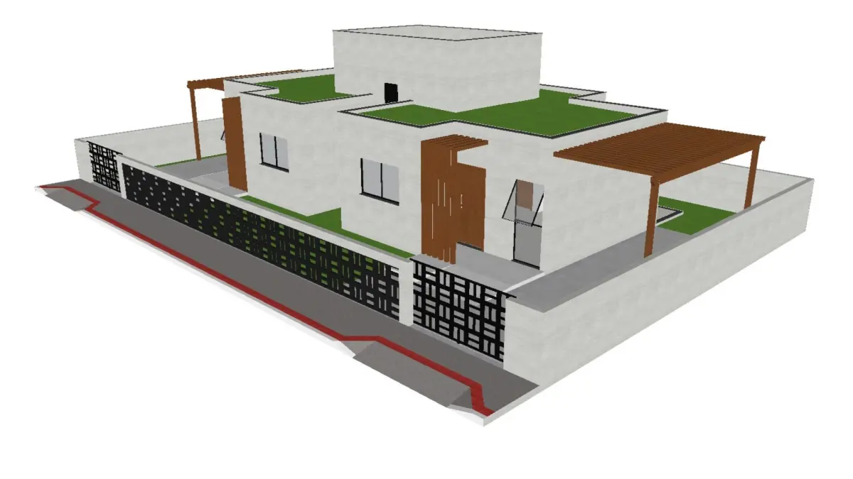 This is a simple residence. Main features:It is a semi-detached residence, that is, two houses in one building;Pure concrete facade, with details in black and wood;Green roof, being a form of sustainability;in the project, we have living room, kitchen, service, 2 bedrooms and bathroom;In the external area we have a parking space and permeable area.
