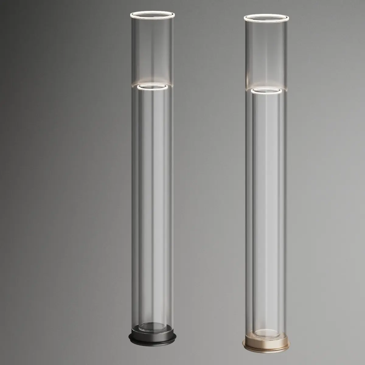 The Floor Light is a minimal floor lamp made from two pure borosilicate glass tubes. In a collision of technology and materiality, a warm LED light source projects invisibly through the glass, to spectacularly illuminate the top edges. The result is a delicate visual presence, with a strong source of light for the space above.